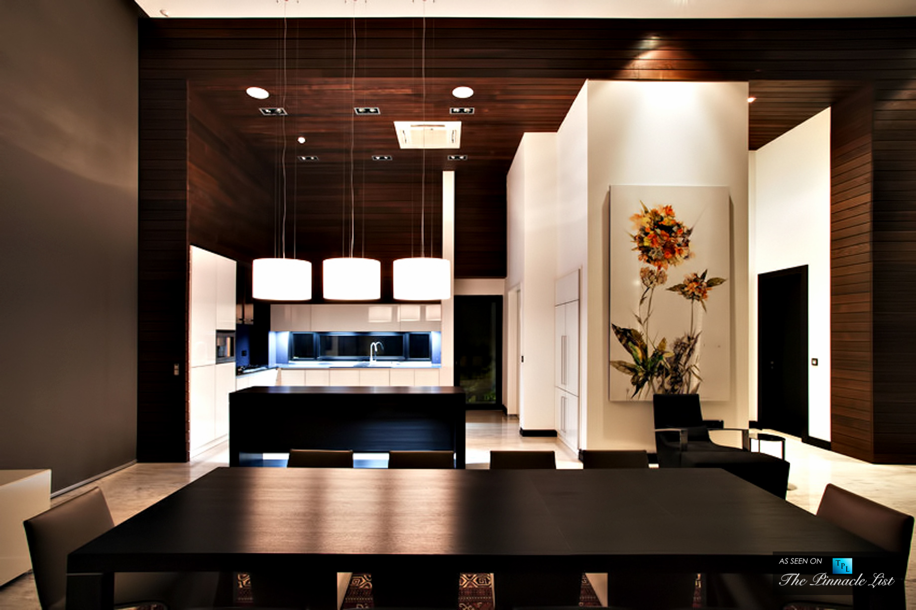 Much like the swimming pool, the structural build of the residence was architected with an L-shaped footprint, imposed over the superposition of two rectangular volumes. This design eliminates any suggestive distance between the outside and inside, allowing for close quarters of extravagant nighttime entertainment on the expansive 43,055 square foot lot.