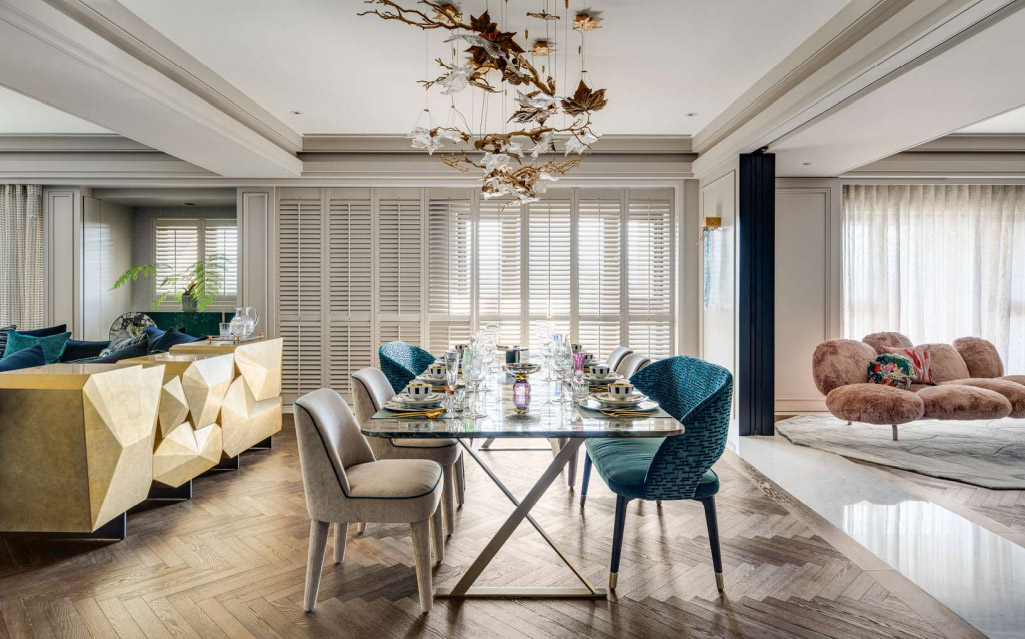 Some noteworthy projects by L’atelier Fantasia include Jewelry Box – Residential Interior – Apartment by the Designer Director IDAN Chiang. The designer said about this project: “through abstraction, a neo-classical design is brought into the space, and a delicate and artistic approach is used to create vivid, gem-like colors and geometric lines, revealing a luxurious but refined residential space.”