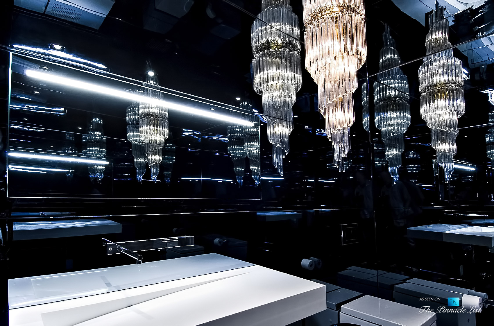 Step into a realm of opulence and modernity with this exquisitely designed bathroom. Sleek black surfaces magnify the room’s dimensions, while cascading crystal chandeliers impart an aura of lavish elegance. The pristine white sink counter acts as a serene counterpoint, offering both style and functionality. Strategically placed lighting accentuates every intricate detail, creating an ambiance that is both mesmerizing and sophisticated. Truly, a testament to luxury living where every detail exudes grandeur.