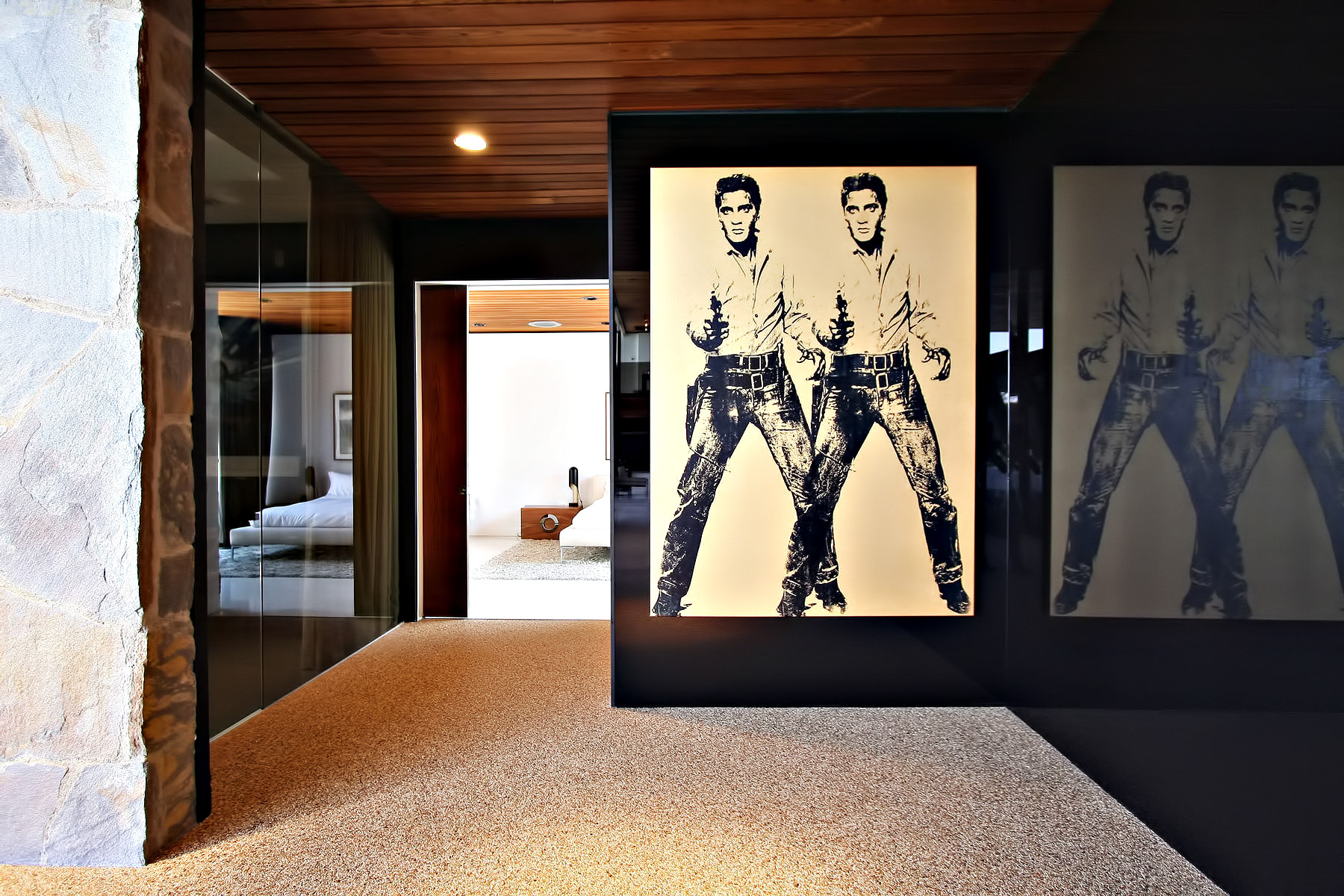 Step into an abode where chic design meets iconic inspiration. This space seamlessly combines rustic stone walls with sleek, contemporary glass partitions, allowing natural light to illuminate both the cozy bedroom and the sophisticated corridor. Dominating the scene, a striking monochromatic artwork of legendary figure, Elvis Presley, evokes a sense of nostalgia and class, while the deep wood ceiling complements the overall warm ambiance. Elegance and modernity coexist, offering potential homeowners a glimpse of the unparalleled sophistication awaiting them. Experience the fusion of artistry and luxury living.