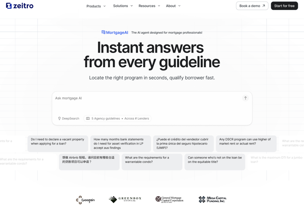 The real magic lies in their Mortgage AI agent. I’ve watched loan officers use DeepSearch to cross-reference over 300 guidelines from 100+ investors in literal seconds. Whether dealing with standard QM or tricky Non-QM scenarios, it provides highly accurate answers backed by exact source citations. Additionally, Zeitro offers a complete suite including a Digital 1003 POS, a live Pricing Engine, and the GrowthHub—a customizable microsite designed to help originators capture organic borrower leads.