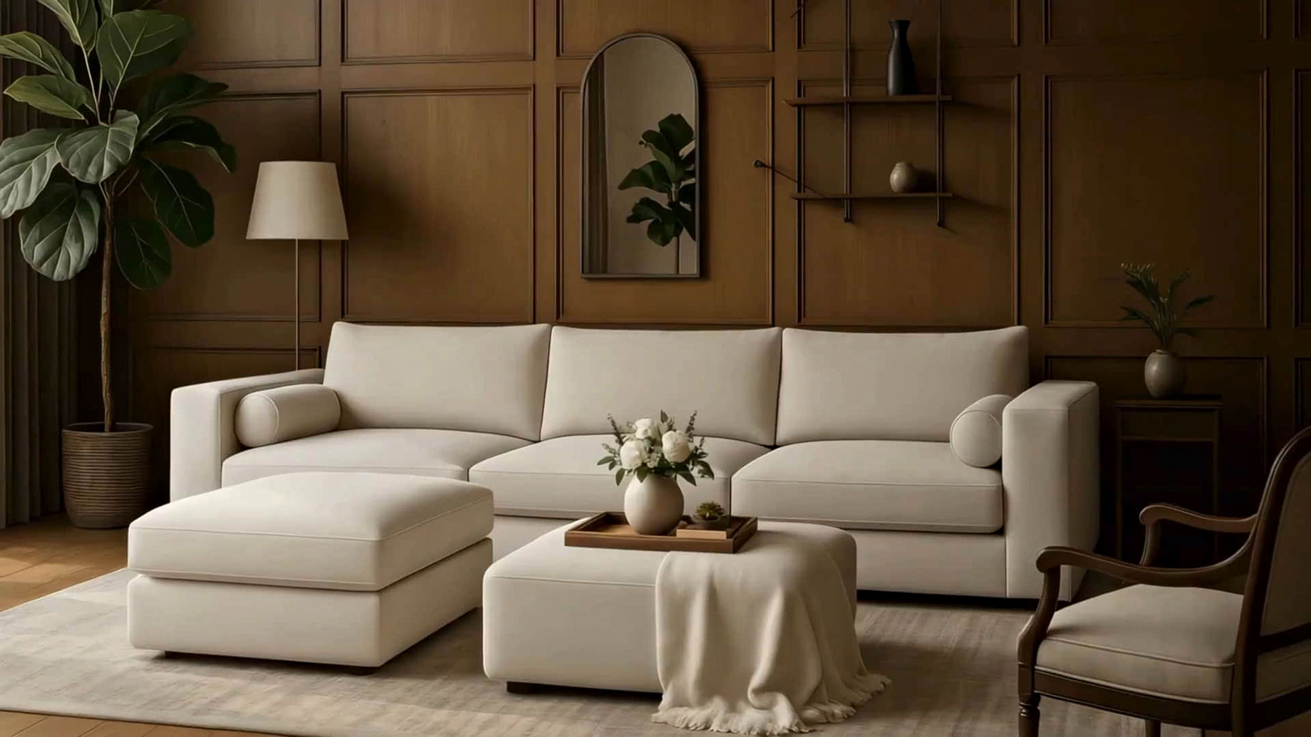 A sophisticated living room featuring a beige modular sectional sofa with a chaise lounge. The room is decorated with neutral tones, complemented by a wooden wall paneling, a large potted plant, a floor lamp, and a small table with a vase of white flowers. The setting creates a warm and inviting atmosphere, ideal for relaxation and social gatherings.