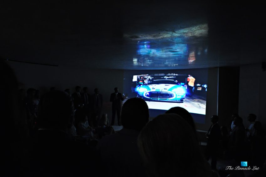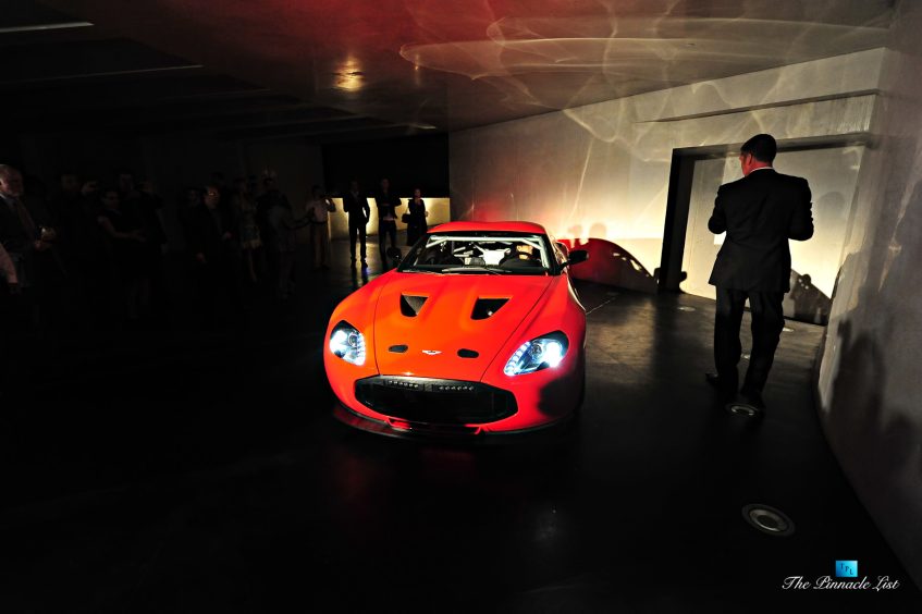 Then, the moment the V12 Zagato finally arrived, Emma Gwyther, founder and CEO of Interluxe, invited everyone downstairs to the Razor theatre, where Aston Martin would play a short video introduction. Then, everyone was drawn into the cavernous and nearly pitch-black Razor garage by the roar of a high-revving engine to witness the glowing headlights of the car that everyone in attendance was there to see. As the lights were turned up, the Aston Martin V12 Zagato supercar was revealed.