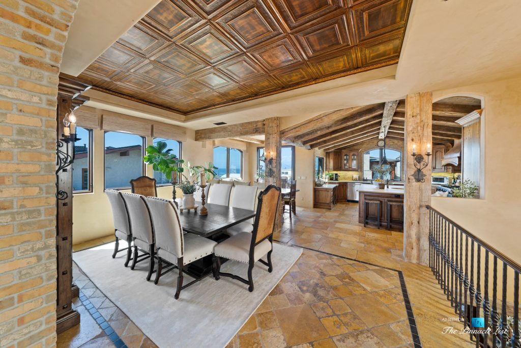 Entertain casually or formally from the open concept kitchen which interacts seamlessly with the formal dining area that extends on to an ocean view breakfast nook with built-in bench seating. The dining area is adorned with a copper finished coffered ceiling. The custom kitchen reflects an authentic coastal villa and is finished with a gorgeous brass apron sink with a Waterstone fixture, a Viking range with pot-filler, a classic over-and-under SubZero refrigerator/freezer with glass door, a center island with a bronze prep sink, and an under counter refrigerated beverage center. A bonus home management station enjoys an ocean view.