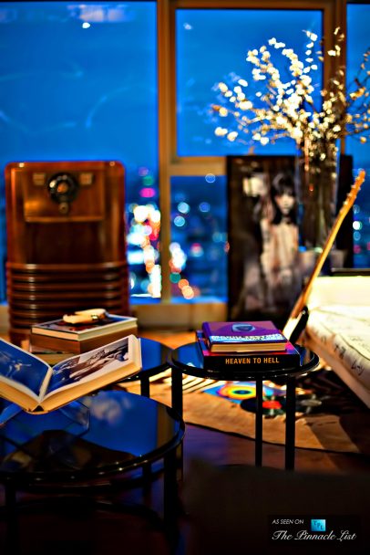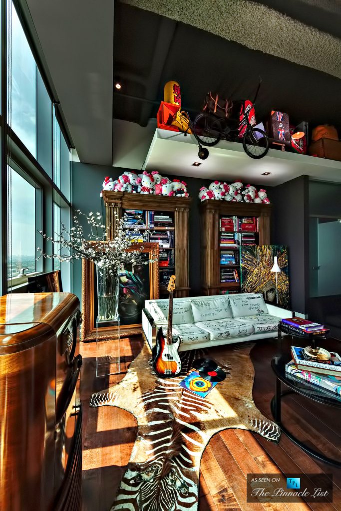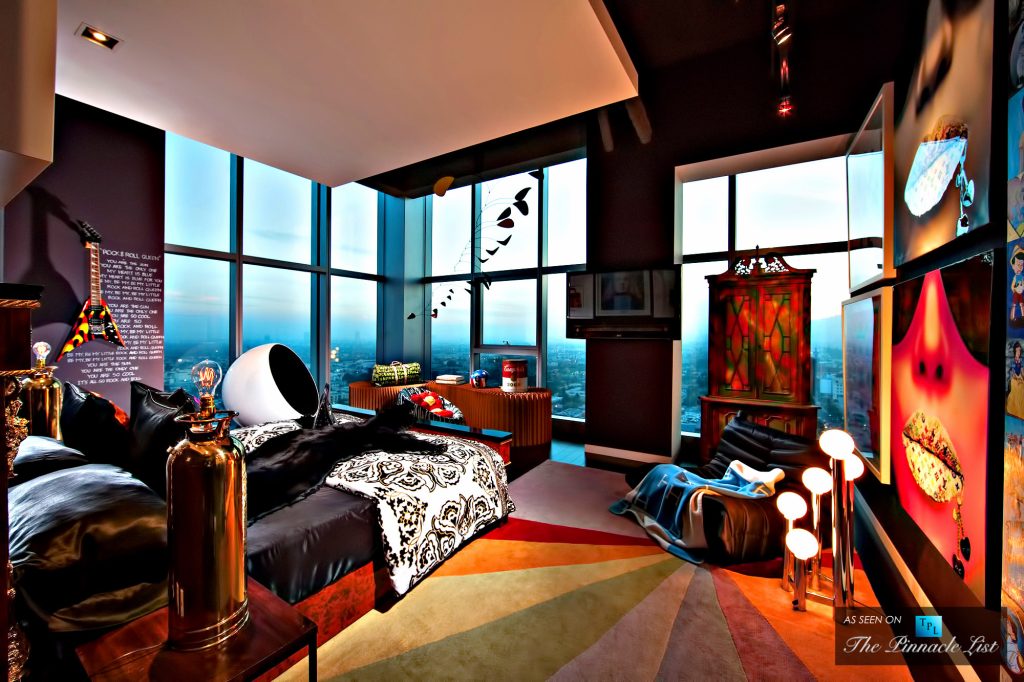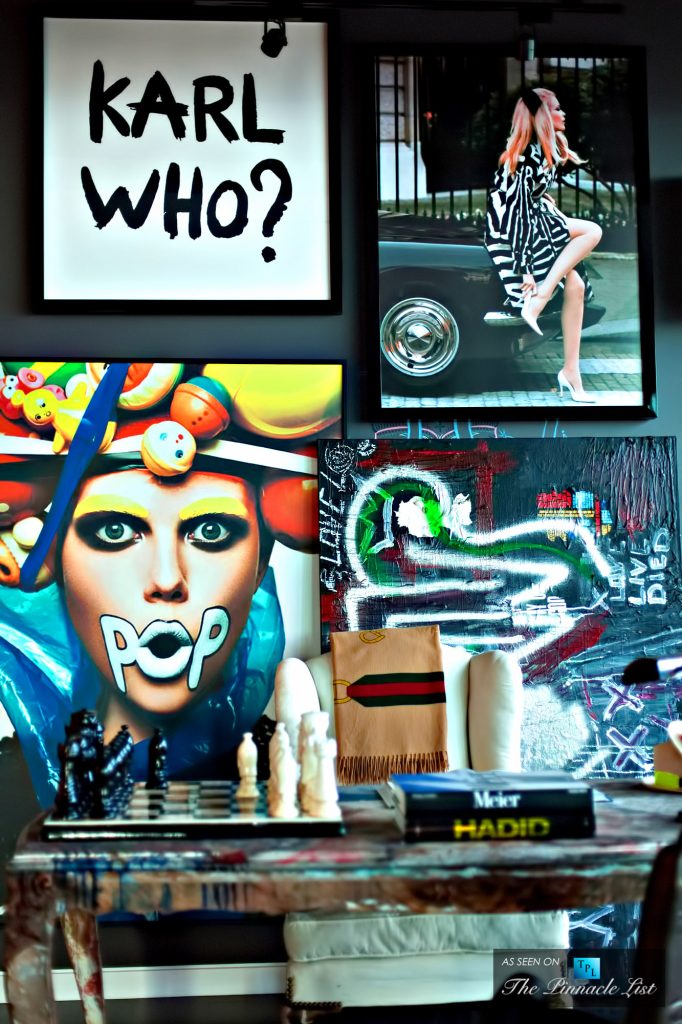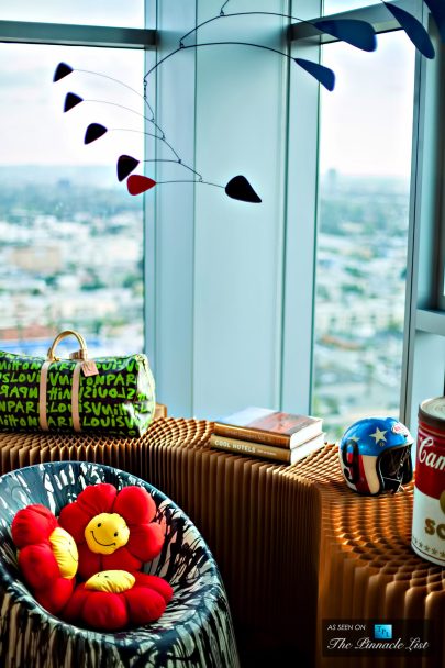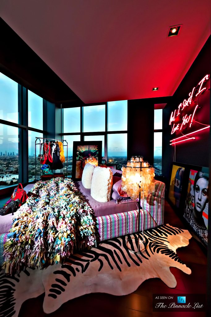 Belgium-born LA interior designer Maxime Jacquet produced a cutting-edge work of art in 2013 when he redesigned the Eva (full of life) Eclectic Penthouse on the 19th floor of the Sunset Vine Tower that he shared with French bowtie designer Ludo Barras. The residence merges high fashion with an explosion of colors, materials, art, and objects into a visceral fusion of style.