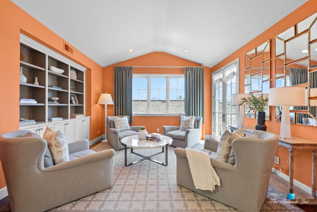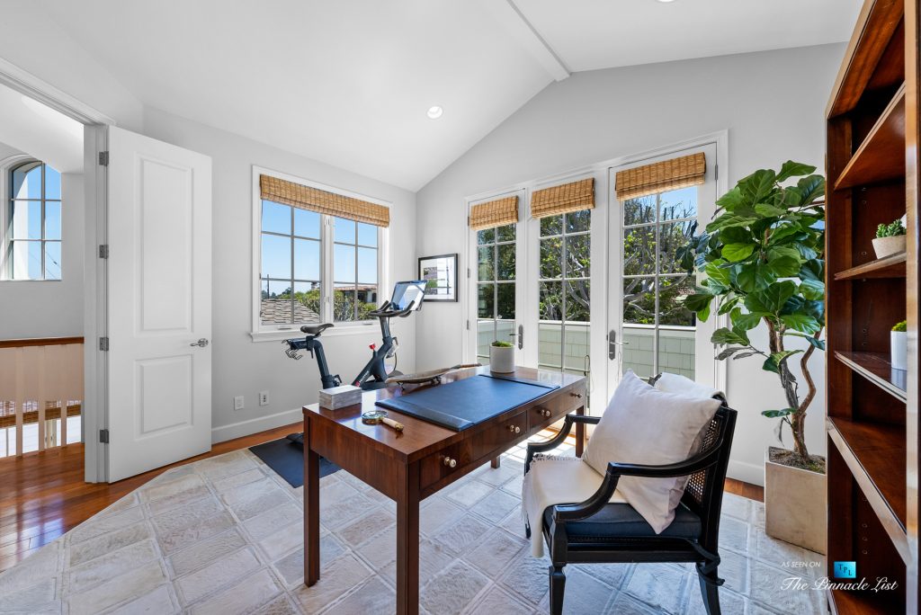On the uppermost level, a large formal dining room sits opposite a family room/den while a custom chef’s kitchen opens to a large, sunny family room, complete with a built-in home office area. The kitchen centers around a large island and breakfast bar topped with fossilized sea grass counters. The island also features a bonus dishwasher drawer and a convenient prep sink. A premium Thermador range has dual ovens, 6 burners and a griddle top. Cabinet-faced appliances and a farmhouse apron sink complete this incredible work space. A cozy breakfast nook features built-in bench seating. Step outside and enjoy al fresco dining from the wrap around deck, complete with outdoor fireplace. Take in views of Downtown L.A., the Hollywood sign and the San Gabriel mountains beyond. A 6th bedroom is also found on the upper level and it currently is used as a home office/gym while drawing in refreshing ocean breezes.