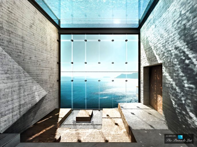The natural beauty of the scenic environment plays a major role within the home as both the front glazing and rooftop pool serve as sources of natural light. Swimmers can enjoy spectacular ocean views and gaze below into the home’s marvellous feat of accomplished architecture that truly is one-of-a-kind. The pool produces a unique effect inside as the sun passes through the billowing body of water, reflecting brilliant patterns into Casa Brutale’s floors and walls. You may be inside a cliff, but you can’t help but feel like you’re under the sea as the liquid above diffuses the light inside the home.