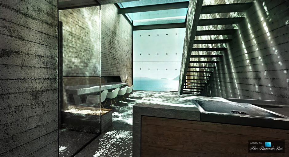 Living on the edge of your seat has never had a more defining picture in luxury real estate than what Greek architects Laertis Antonios Ando Vassiliou and Pantelis Kampouropoulos of OPA Works have designed. Their rendered designs for what would be an awe-inspiring architectural masterpiece pits a sleek, modern home wedged cliffside, sunken clifftop entirely within rock with a luxurious infinity pool, technically rooftop, but physically flush ground level on the edge of a cliff. They call this Casa Brutale and it is breathtaking and terrifying at once yet exhilarating in every way.