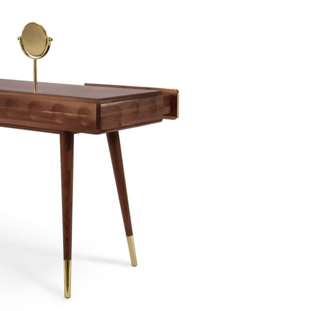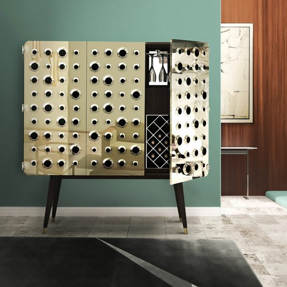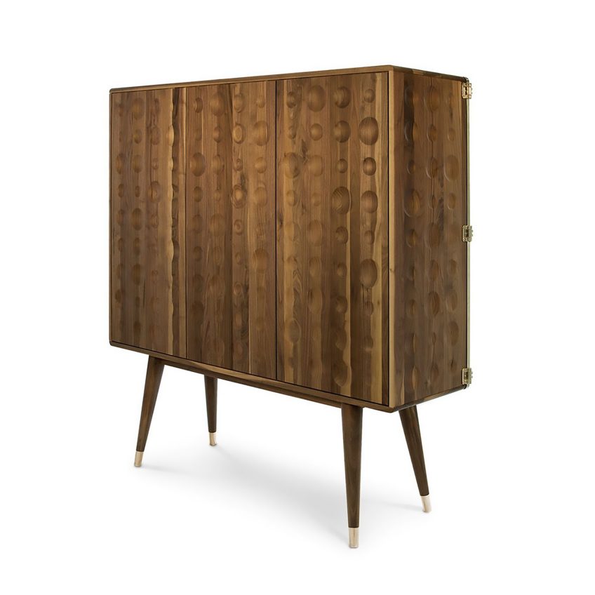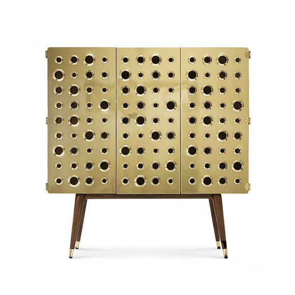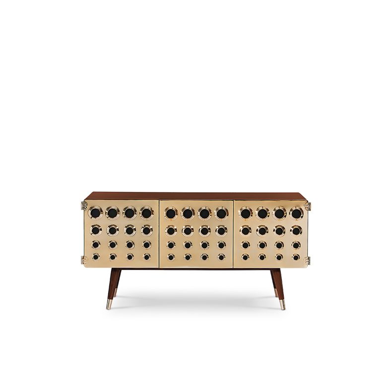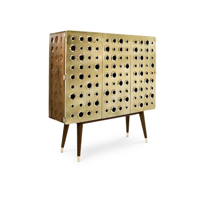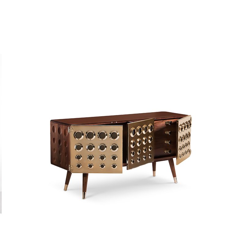 If you are a fan of the James Bond world, you will certainly be dazzled with the golden eye-catching luxury mid-century modern style furniture pieces of the MONOCLES Sideboard, Cabinet and Table collection from Essential Home. Made in solid walnut wood and brass with knurled details. Circles are engraved on the sides and back in the walnut wood, while the golden doors fulfill the setting with a kind of ‘kiss kiss bang bang’ spirit.
