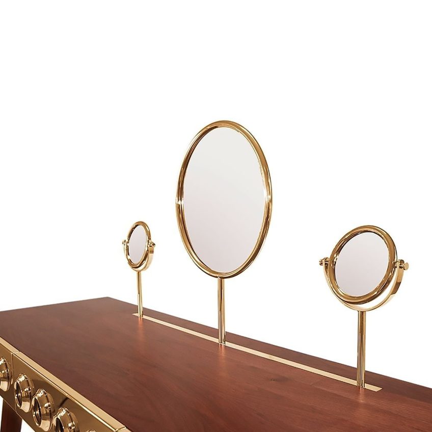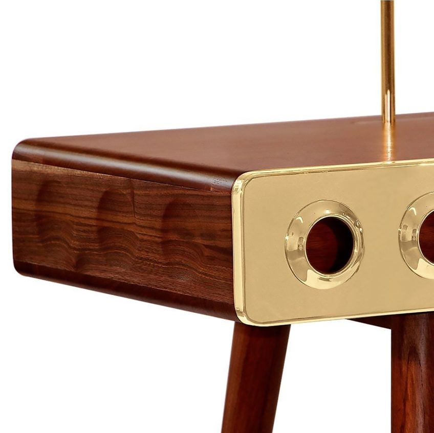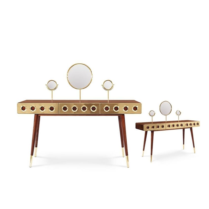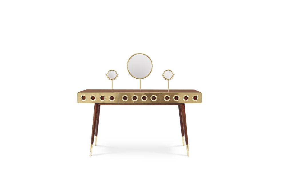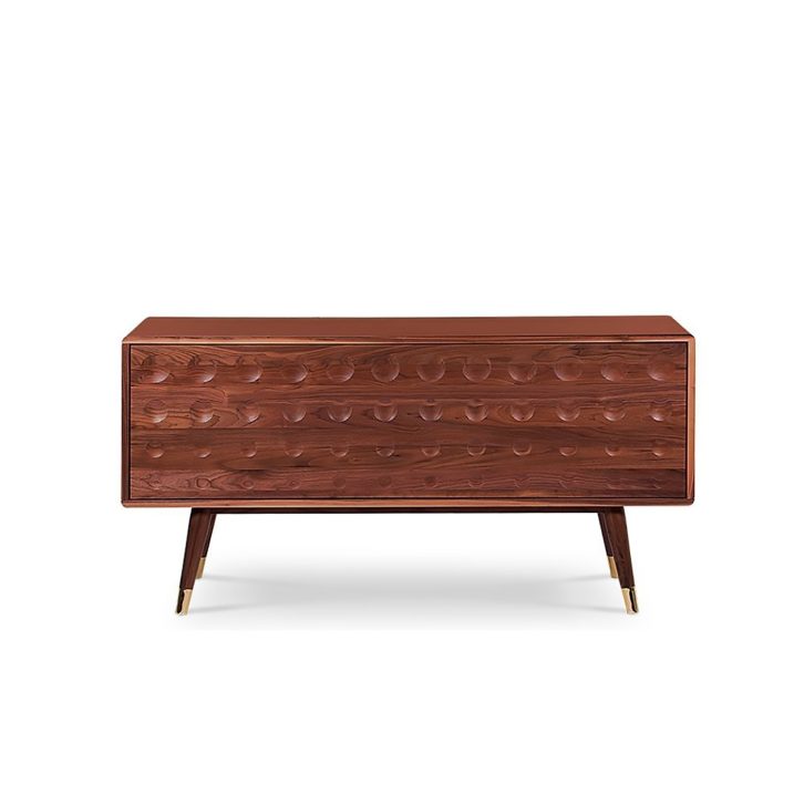 If you are a fan of the James Bond world, you will certainly be dazzled with the golden eye-catching luxury mid-century modern style furniture pieces of the MONOCLES Sideboard, Cabinet and Table collection from Essential Home. Made in solid walnut wood and brass with knurled details. Circles are engraved on the sides and back in the walnut wood, while the golden doors fulfill the setting with a kind of ‘kiss kiss bang bang’ spirit.
