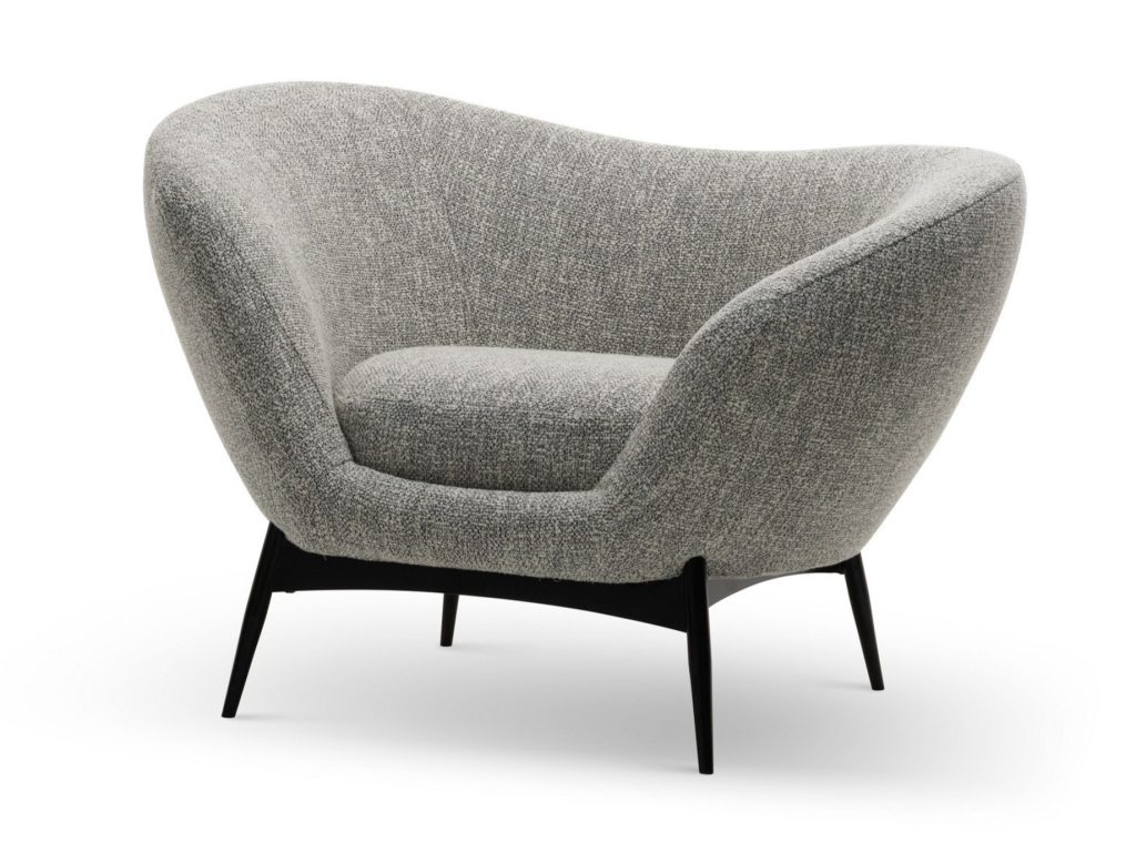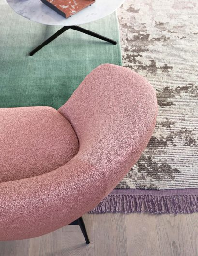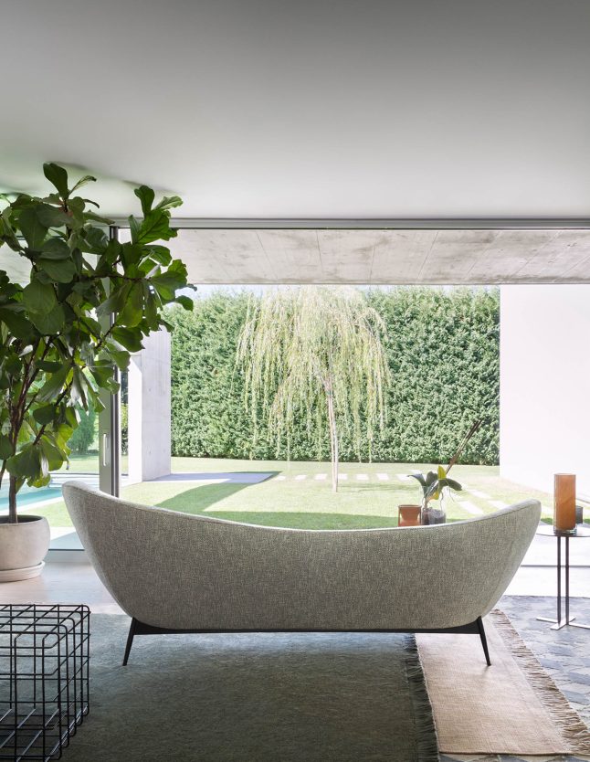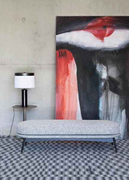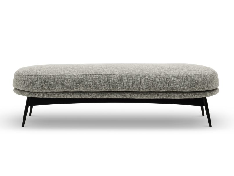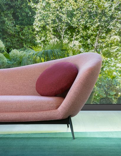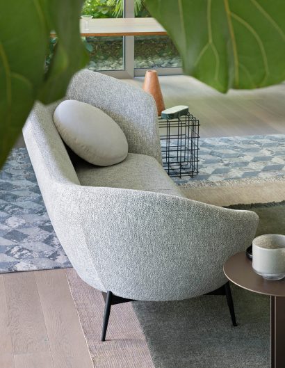 The asymmetric curves that enclose it are the inspirations for the Oltremare armchair that completes the collection alongside a padded bench. A comfortable nest suspended on a slim varnished metal base, whose essential lines render, by contract, the armchair’s silhouette even more interesting.