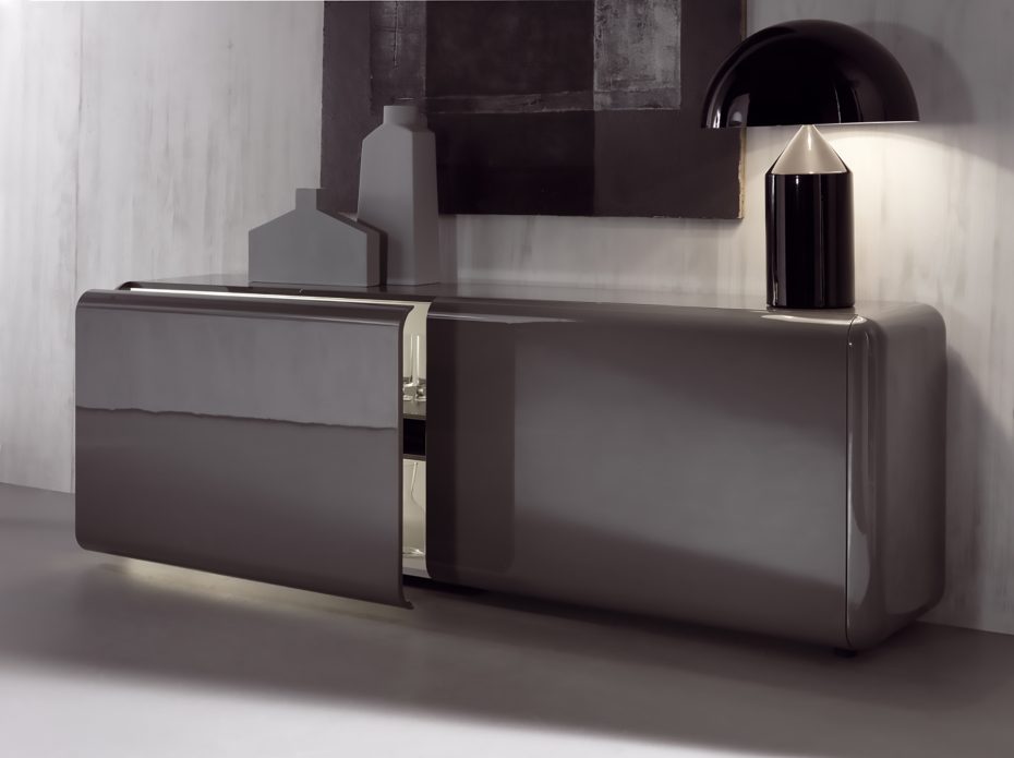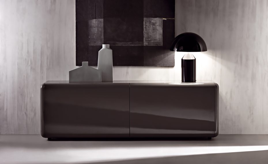 The sideboard which expresses Acerbis technological research with its sinuous forms and dual door opening mechanism. High sideboard whose body perfectly calibrated and rounded, enclosed with a strong gesture qualitative and formal by two sides shell.