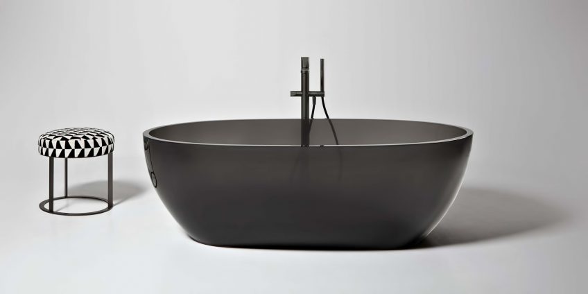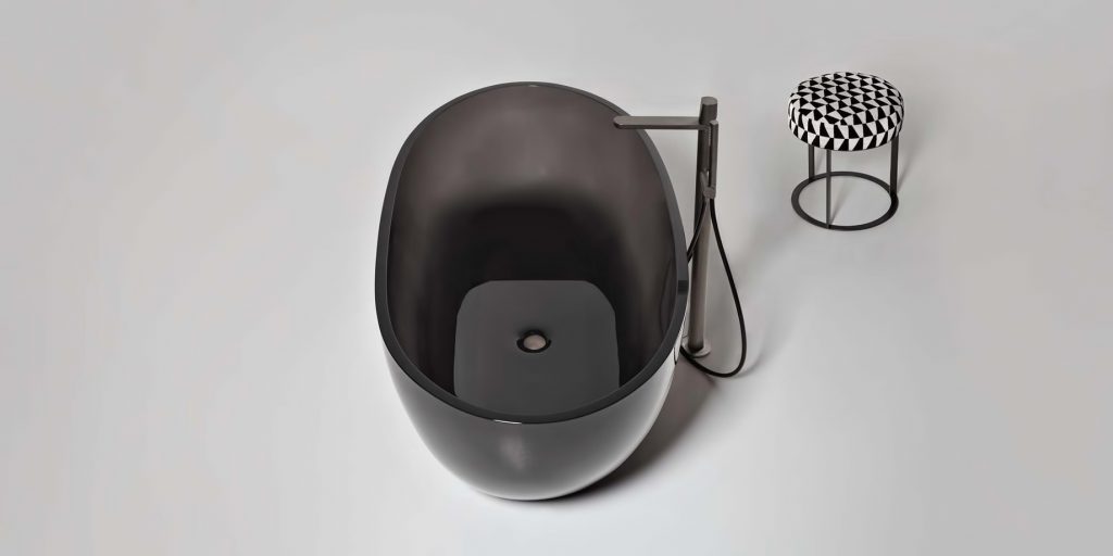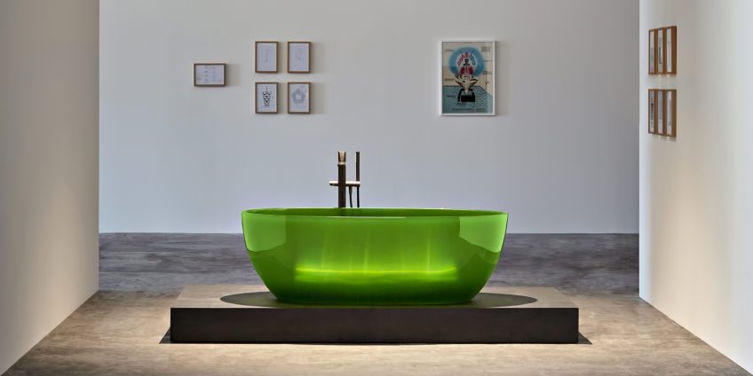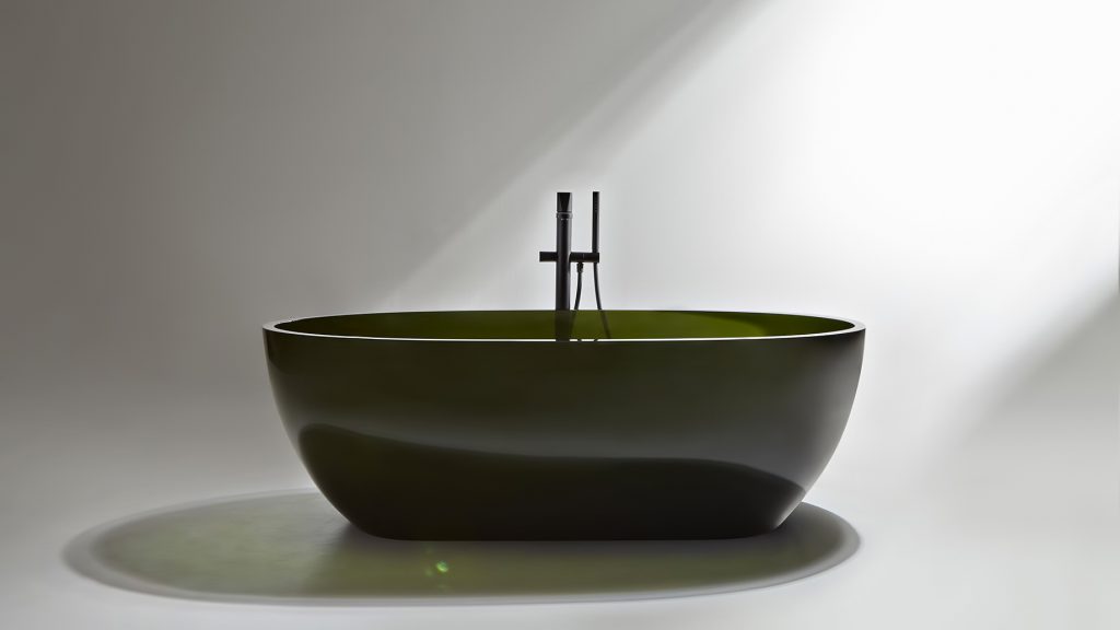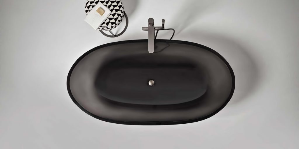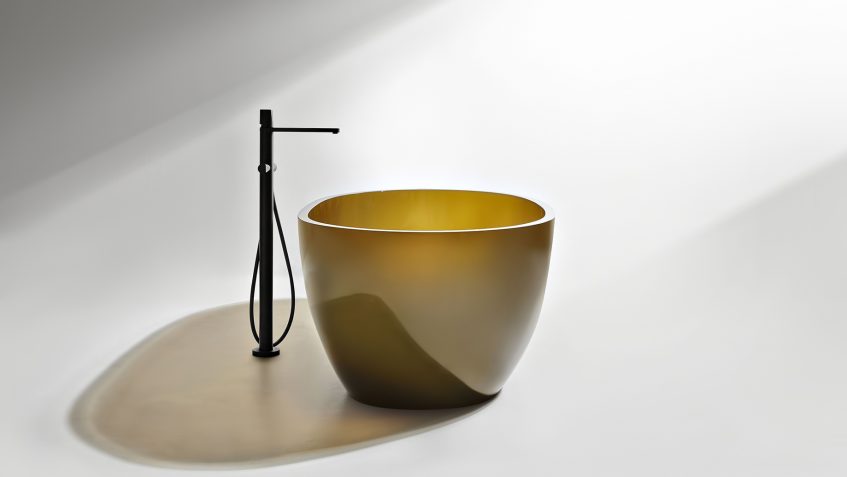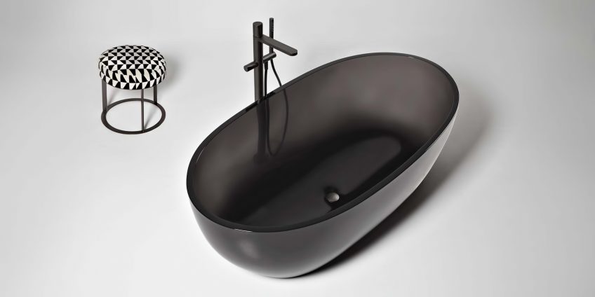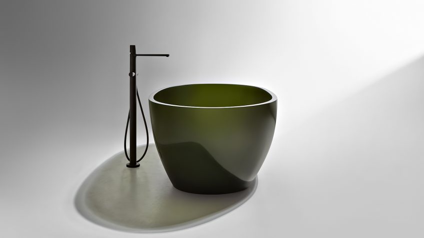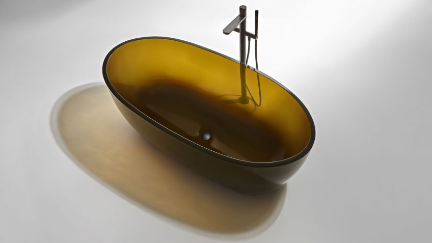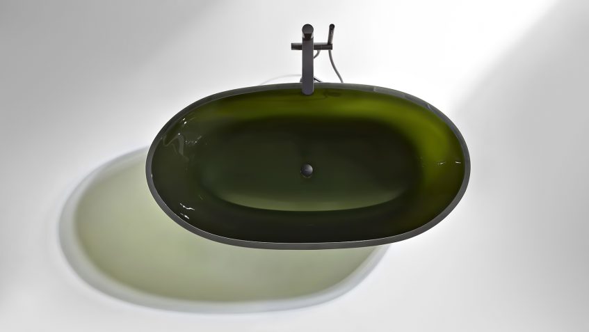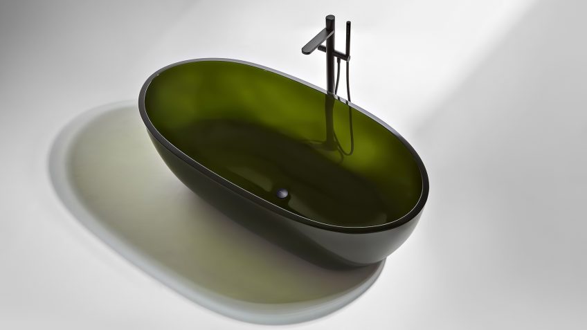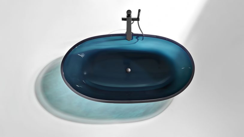 A new resin with extraordinary technical characteristics, designed to give lightness yet at the same time solidity to bathtubs. Cristalmood is a colored resin, transparent with a glossy finish, composed of high-quality polyester resin and coloring pigments; has passed the anti-corrosion tests (salt spray) and can be cleaned with all the most common detergents. Thanks to the composition, objects made from Cristalmood weigh about 30% less than those made with solid surfaces.