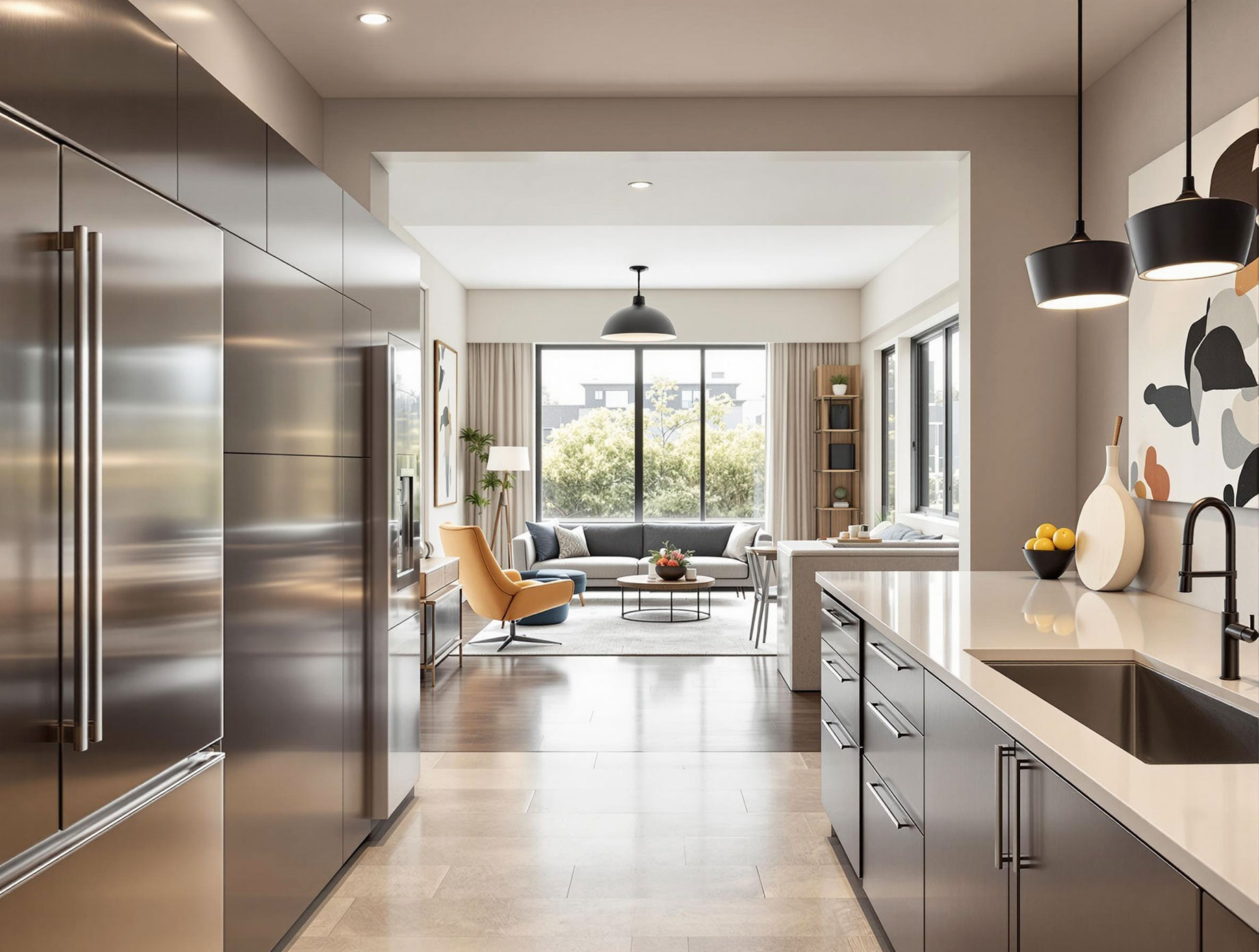 A beautifully designed living space showcasing a modern kitchen with sleek countertops and a full-size refrigerator, adjacent to a cozy living area with stylish furniture. The room is filled with natural light from large windows and features smart storage solutions and a cohesive color palette with pops of color and various textures.
