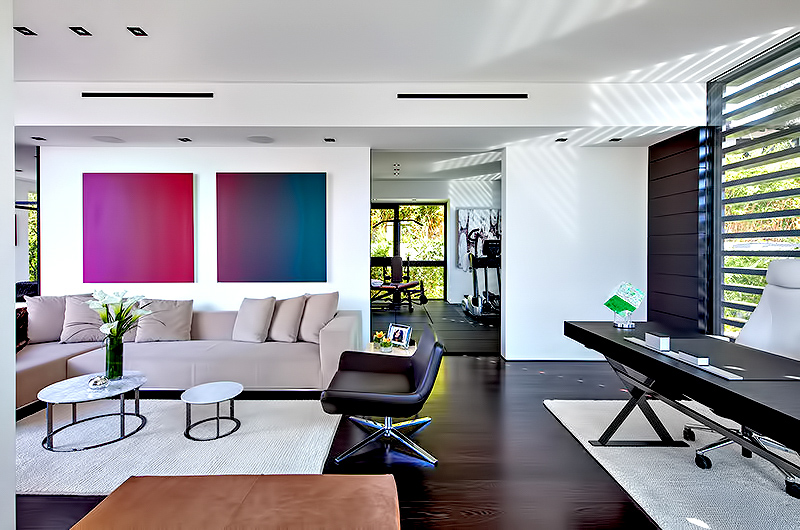The master bedroom claims the third floor all to itself, with spacious his and her closets, 60’’ glass fireplace, Italian cabinetry, a stunning master bath/spa and a private outdoor 2,500 sq. ft. deck featuring a 6-person hot tub and some of the best city views in Los Angeles. On the other side of the property, the guest suite sits above the five-car garage providing a living room, a gym, and a small office.