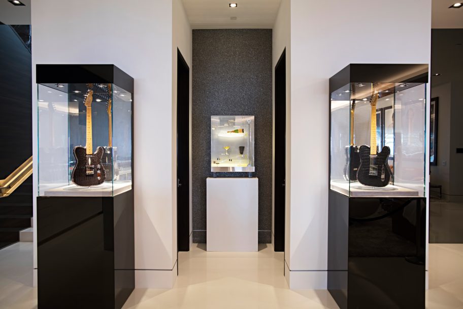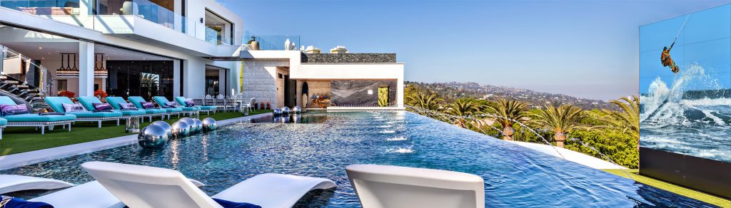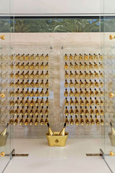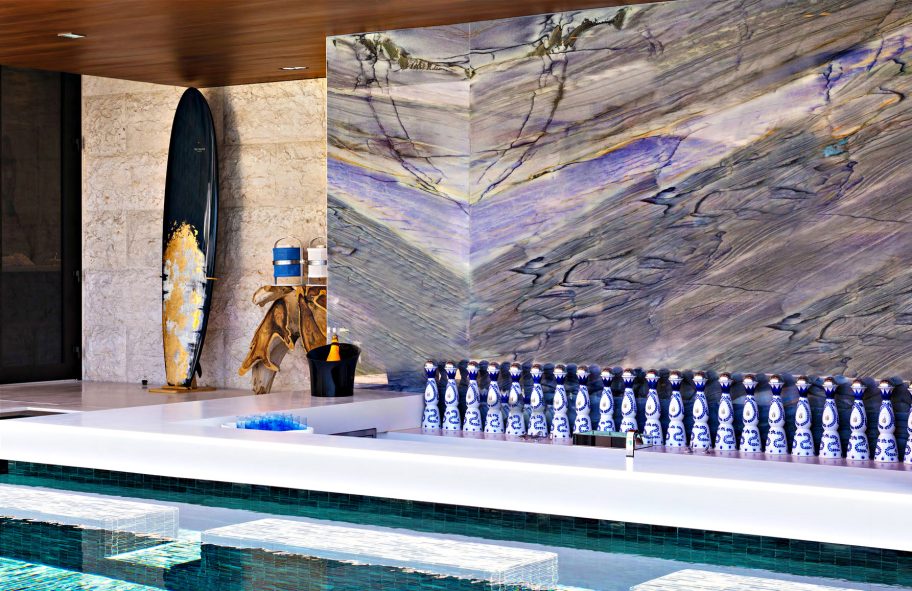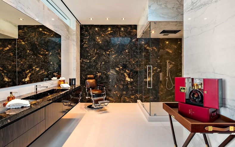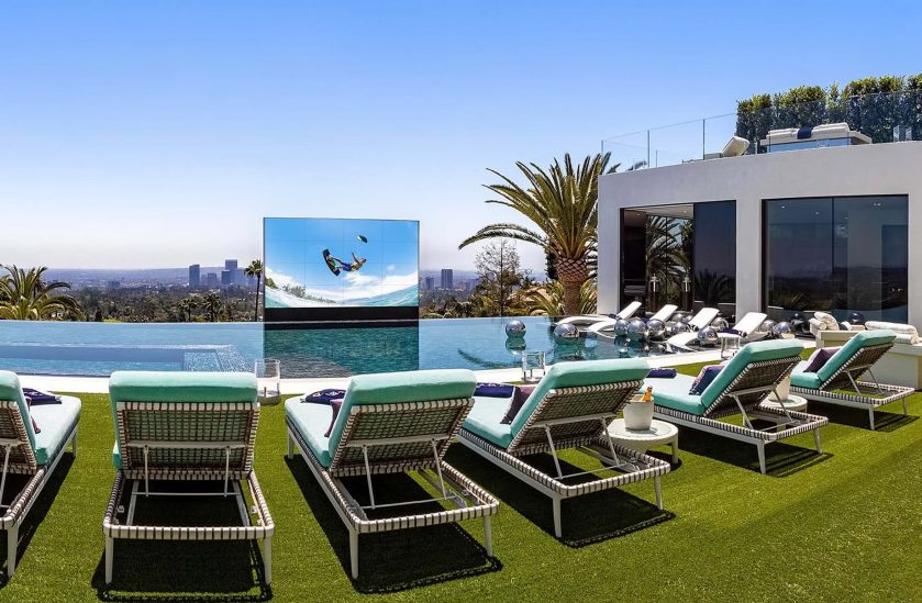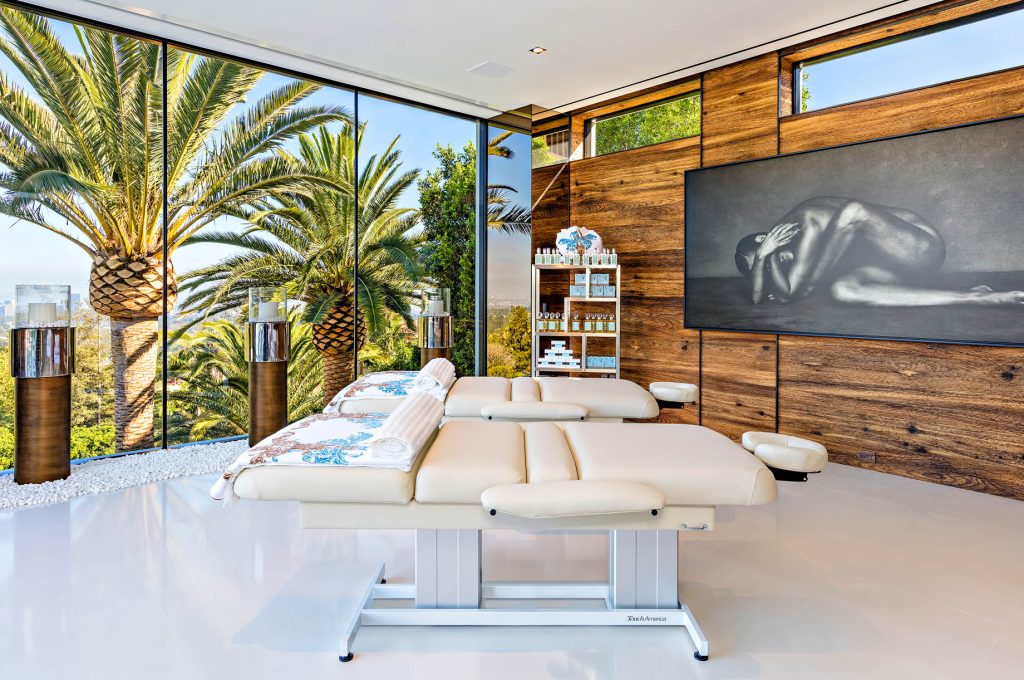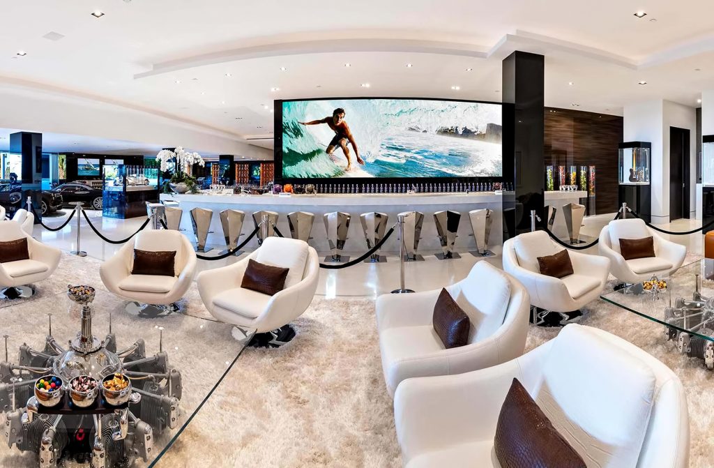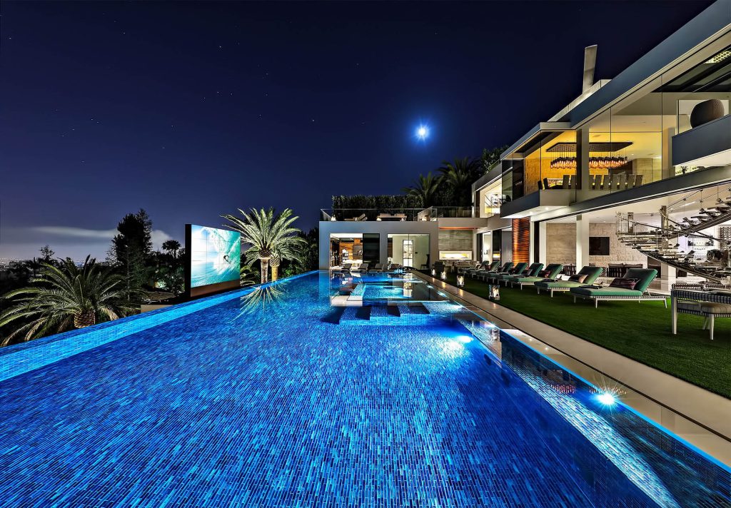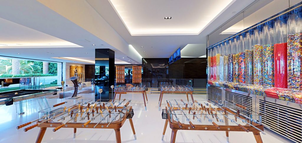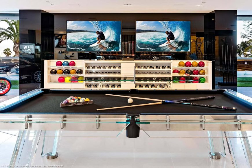 Located in the confines of ultra-exclusive Bel Air Enclave, this triumphant marvel includes two master suites, 10 oversized VIP guest suites, 21 luxury bathrooms, three gourmet kitchens, five bars, a massage studio/wellness spa, state-of-the-art fitness center, 85-foot glass tile infinity swimming pool, 40-seat 4K Dolby Atmos Theater, four-lane bowling alley/lounge, sprawling auto gallery with cars valued at more than $30 million, seven-person full time staff, over 100 curated art installations, an outdoor hydraulic pop-up theater, two fully-stocked champagne/wine cellars, massive assorted candy wall and the most advanced home tech system in the country.