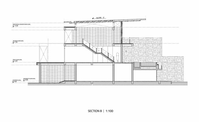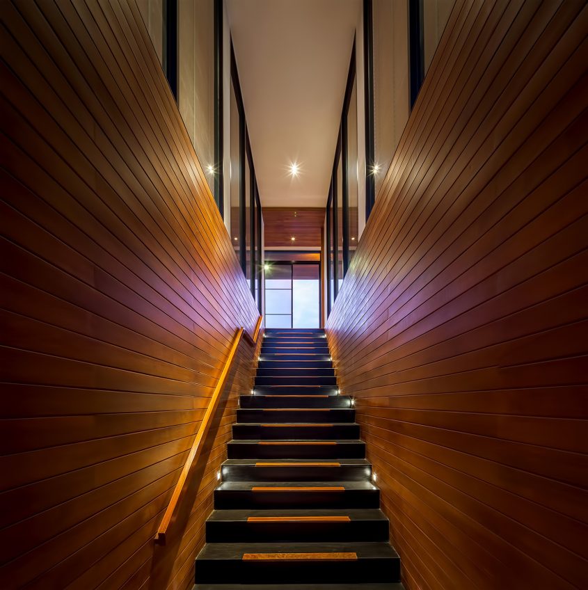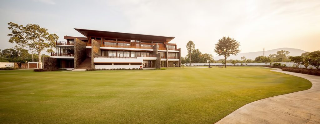 The house is accessible by the gradual walking path and steps to the second floor where the common area is located. This area consists of living, dining, study, and working area. The swimming pool, which is wide opened to the landscape outside and connected to the terrace, is also situated in this area. When reaching the third floor, the space for multiple residents is found. This space is split into two villas that have a devisable drawing room, adjacent to the living room, act as the decoration space and exercising area. The first floor of the house is considered as the basement of the house where no regular functions are defined. However, the backup drawing room is placed in the area along with the relaxing area that is connected to the golf course to create the flow between the interior space and the nature outside.