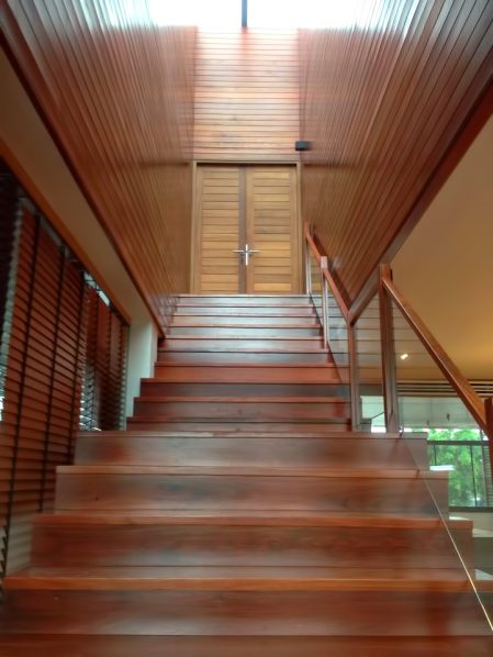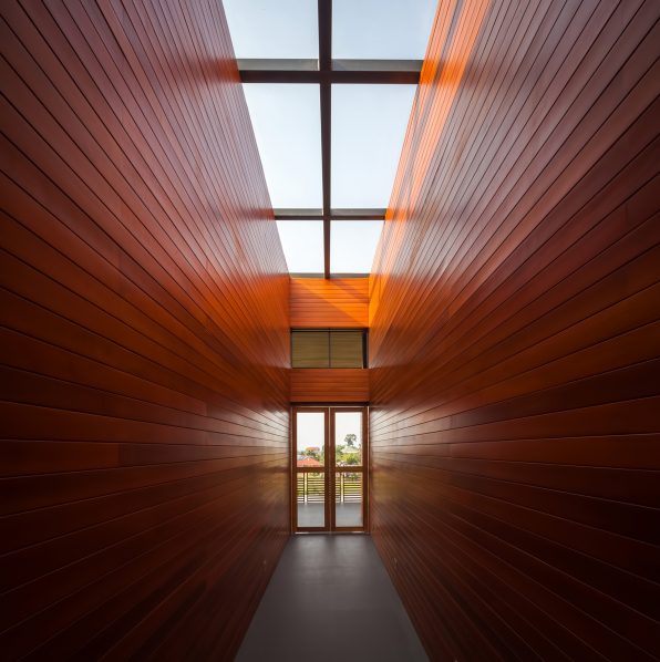 The enormous roof covers almost 80 percent of the house. However, it is designed to be as thin as possible. The roof along with the large ceiling that covers all the hall areas of the house offers the warm atmosphere to the house despite the largeness of the house. Natural materials are selected as the main material of the house to escape from the intentional tidiness and to let the material display its natural beauty as much as possible.