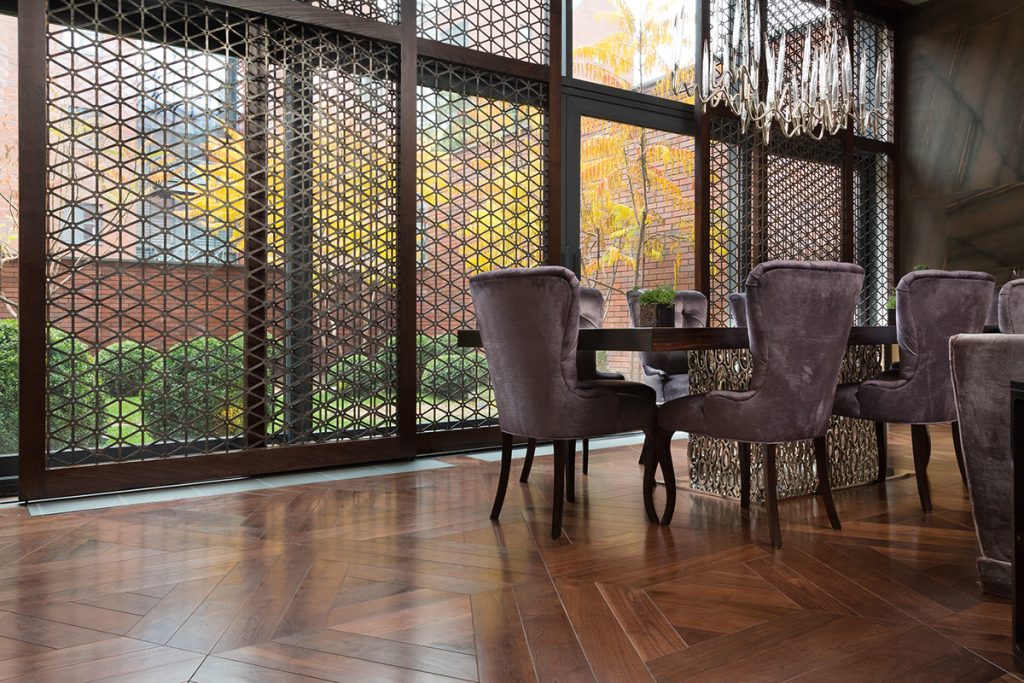 Ornaments set the rhythm and the mood for the whole interior, complying with the Art Deco tradition โ geometric and vegetative decorations, applied on the walls and on the floor, on some ceilings, and in decorative details. The interiors are realized in placid monochrome scales of dark brown, terracotta, cream, sandy, and silvery grey tones. The visual accents are expressed with eye-catching pieces of furniture, lighting objects and various rich textures.