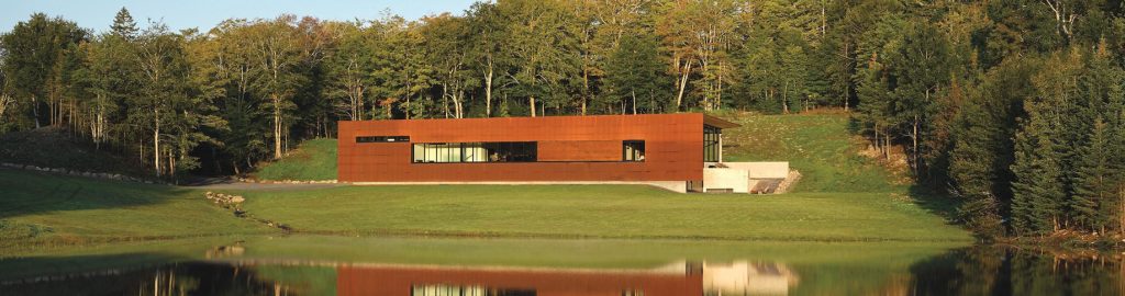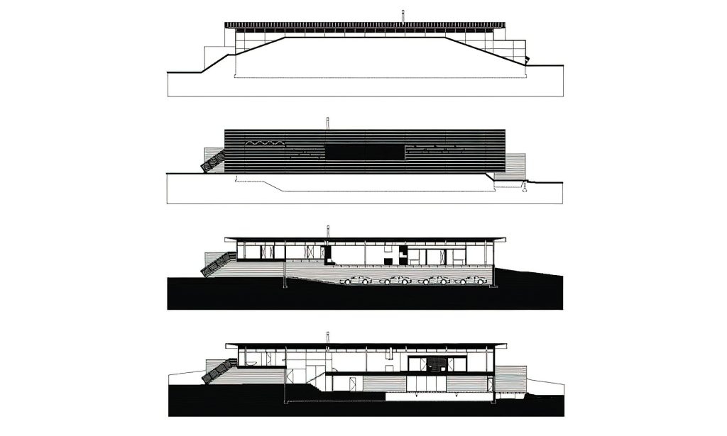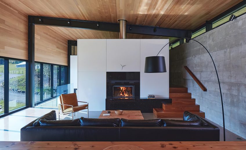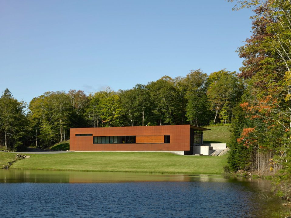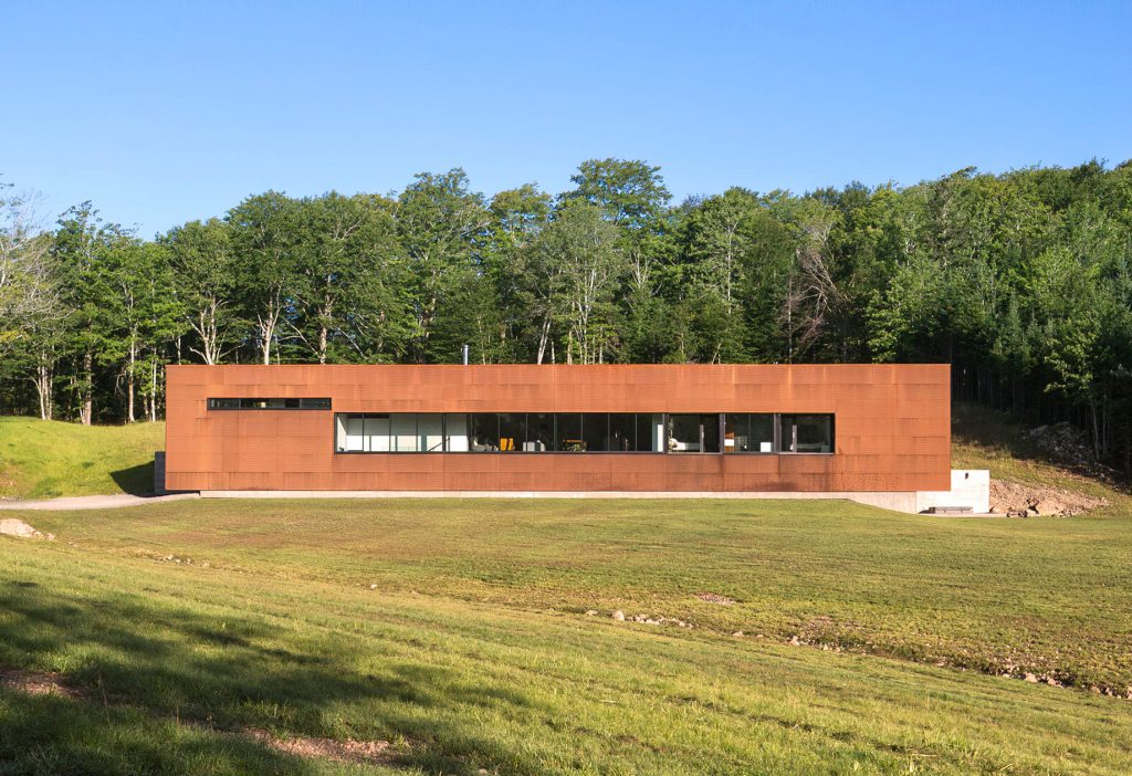 The house is designed in the form of an extruded, folded corrugated Corten steel “clip” supported by structural steel frames spaced 20 feet (6 meters) apart. It sits entirely within a 144-foot (44-meter) long and 20-foot (6-meter) high concrete retaining wall structure. The main level is organized around two central cores that contain the hearth and kitchen, while private spaces are located at either end of the layout with views of the surrounding forest.