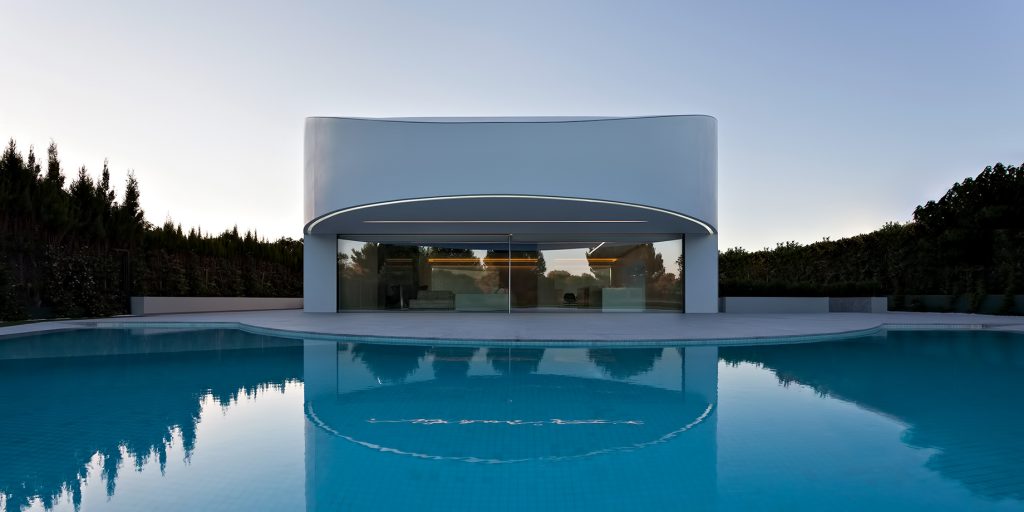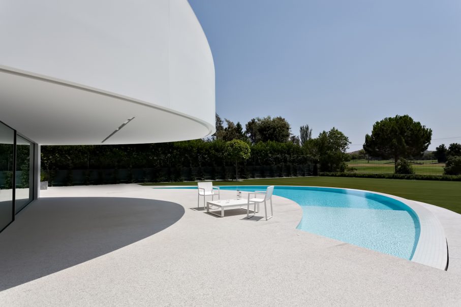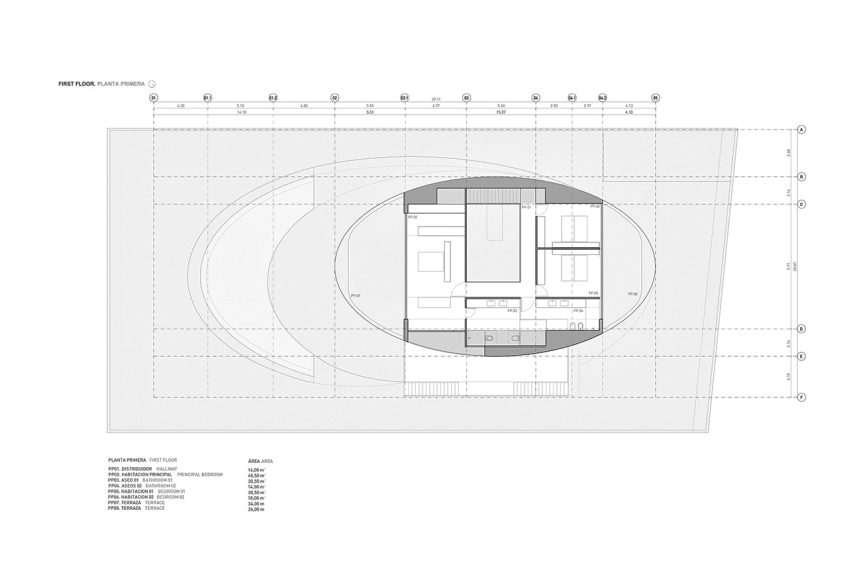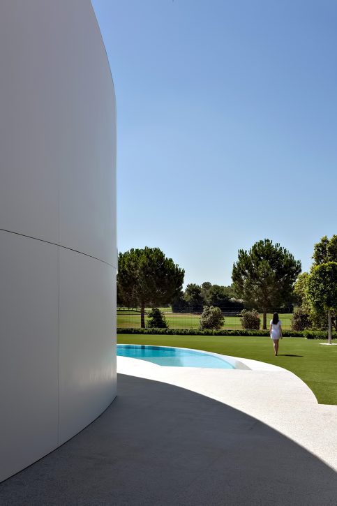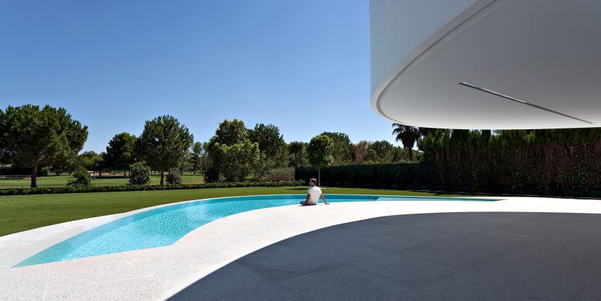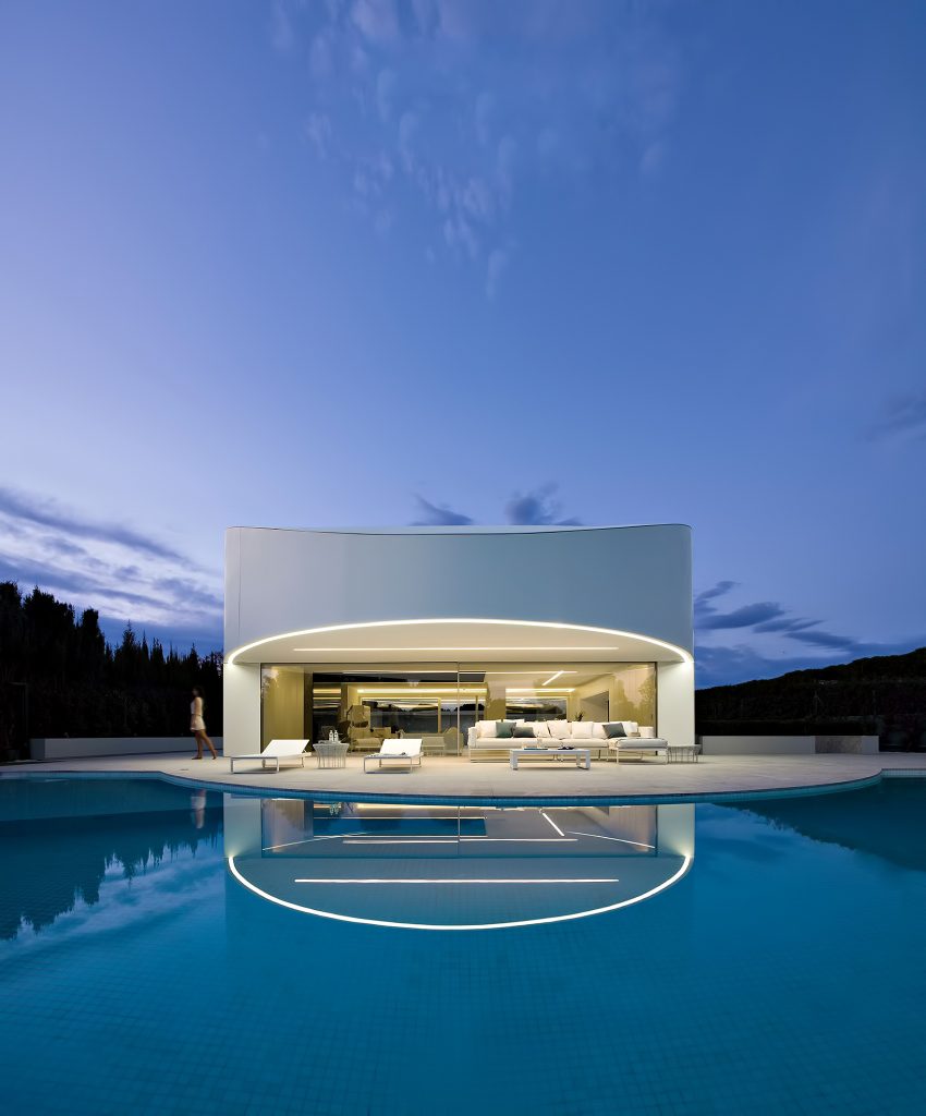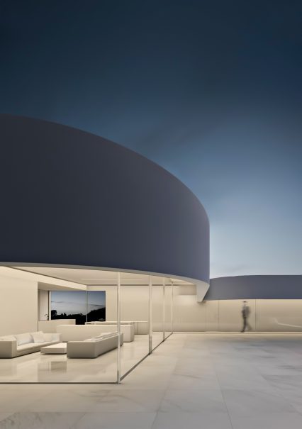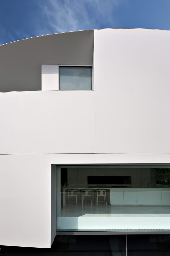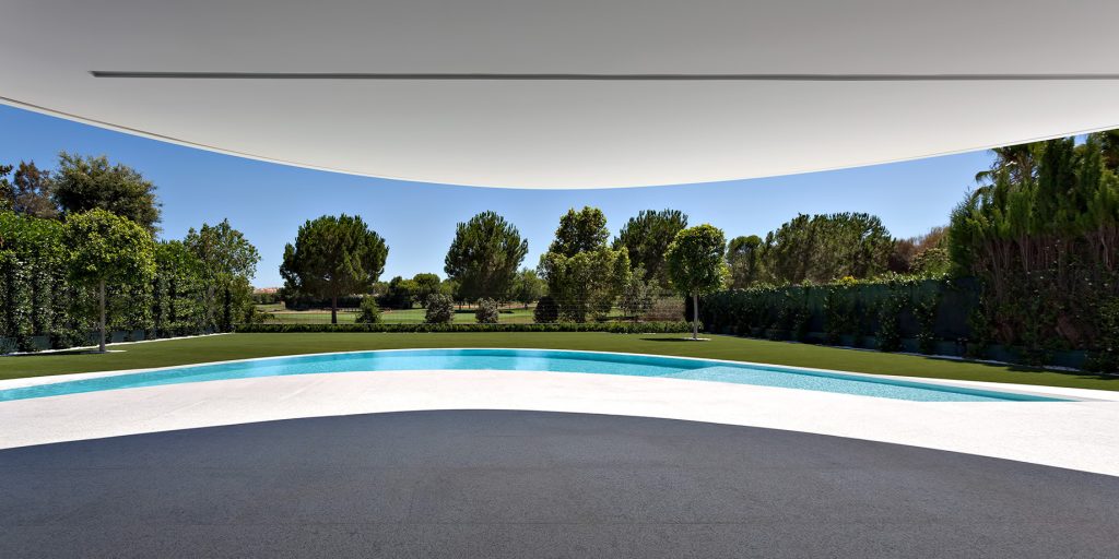 The concrete structure of the ground floor supports by four supports the cover arch from which hangs the floor of the night zone. This structure is covered by a monolithic ventilated facade made with a Solid Surface that with simple curvature and without the need to thermoform it adapts to the geometry of the piece. The rest of the materials go from white to black through all grays. All aspects of this incredible edifice are superimposed on the singular narrative that this transforming environment is a space to relax and perceive the exclusivity of architectural privilege.