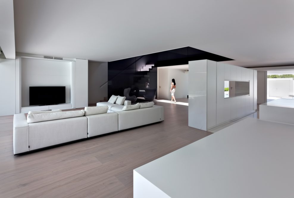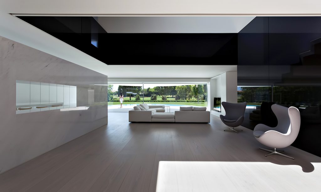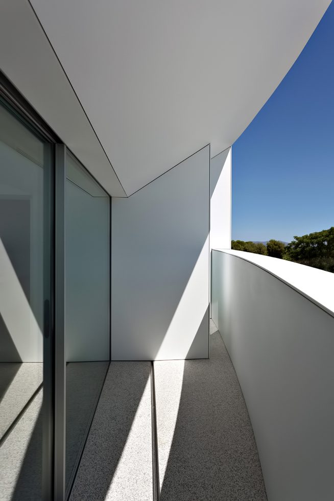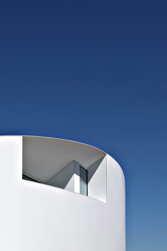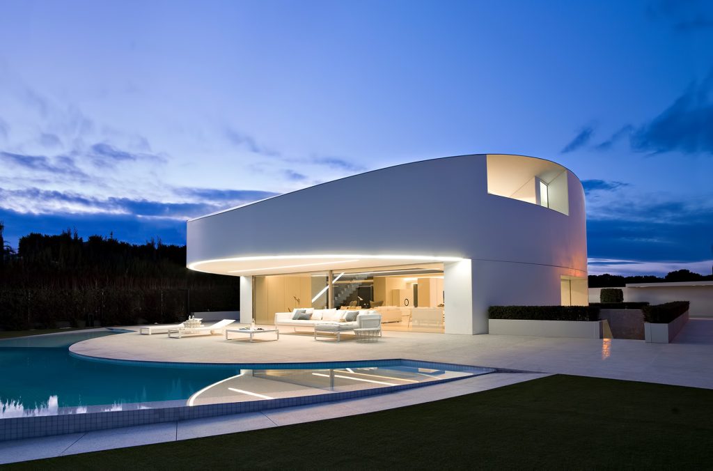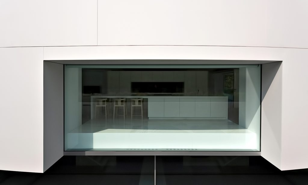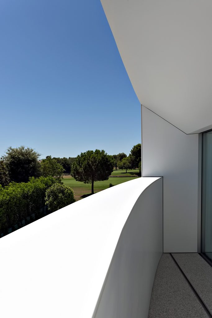 The concrete structure of the ground floor supports by four supports the cover arch from which hangs the floor of the night zone. This structure is covered by a monolithic ventilated facade made with a Solid Surface that with simple curvature and without the need to thermoform it adapts to the geometry of the piece. The rest of the materials go from white to black through all grays. All aspects of this incredible edifice are superimposed on the singular narrative that this transforming environment is a space to relax and perceive the exclusivity of architectural privilege.