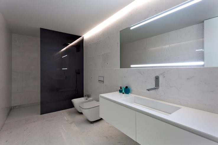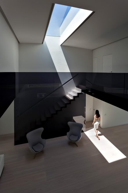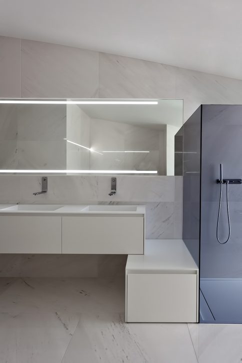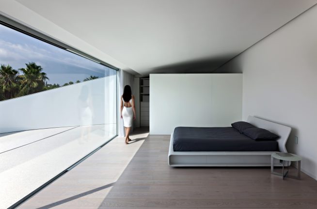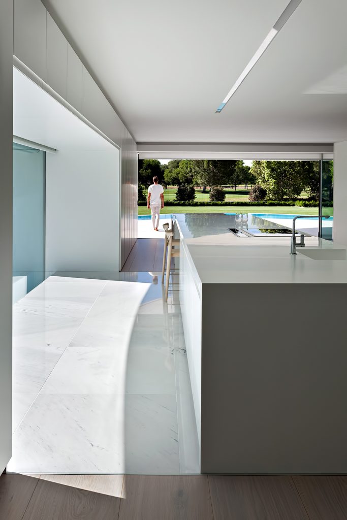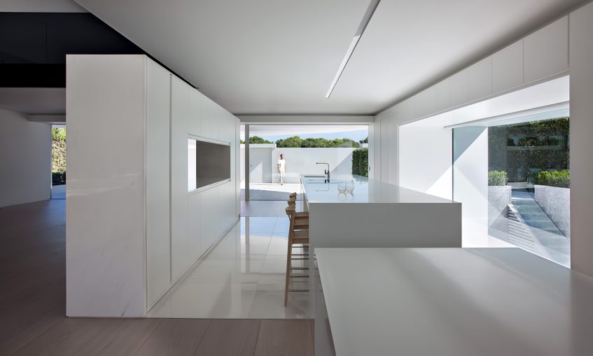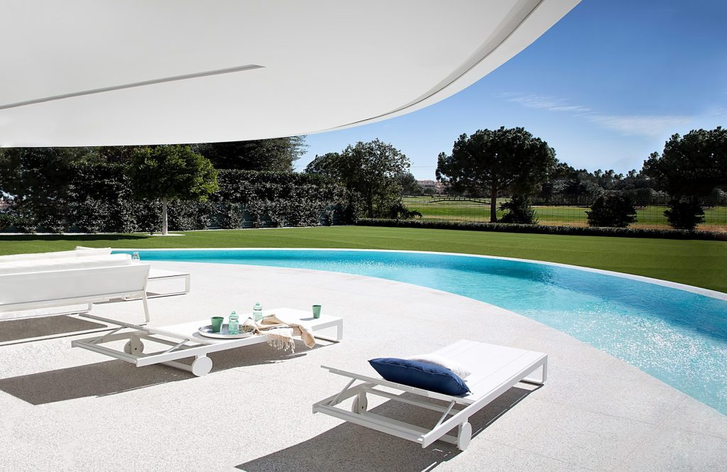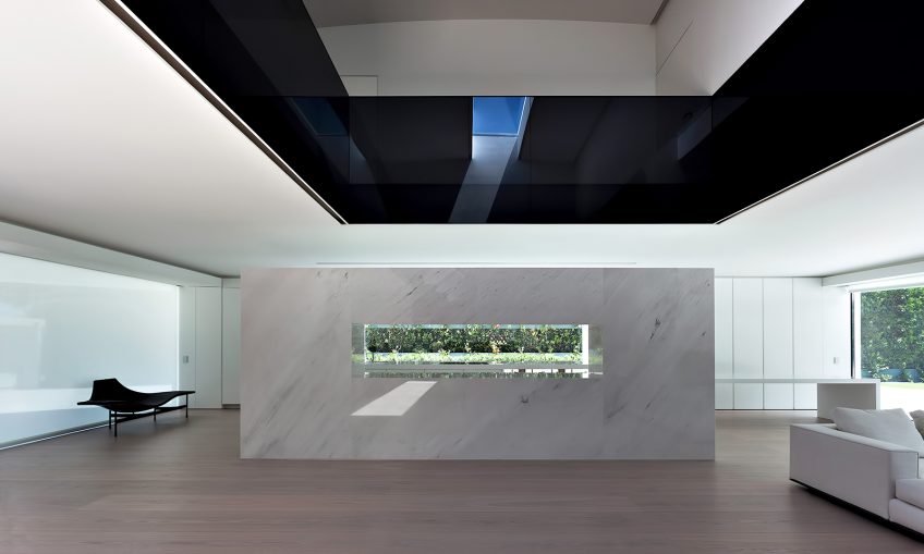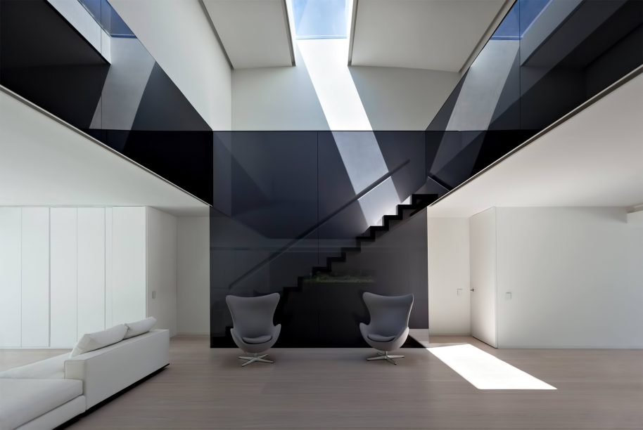 The concrete structure of the ground floor supports by four supports the cover arch from which hangs the floor of the night zone. This structure is covered by a monolithic ventilated facade made with a Solid Surface that with simple curvature and without the need to thermoform it adapts to the geometry of the piece. The rest of the materials go from white to black through all grays. All aspects of this incredible edifice are superimposed on the singular narrative that this transforming environment is a space to relax and perceive the exclusivity of architectural privilege.
