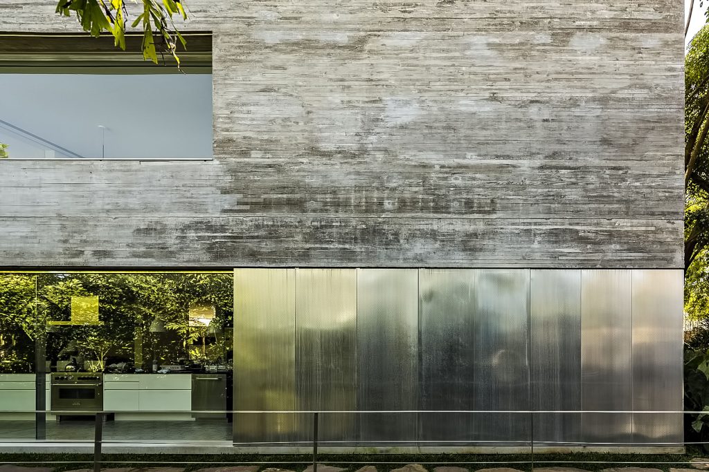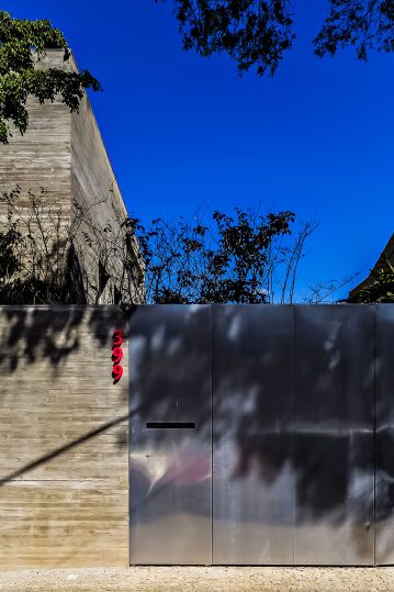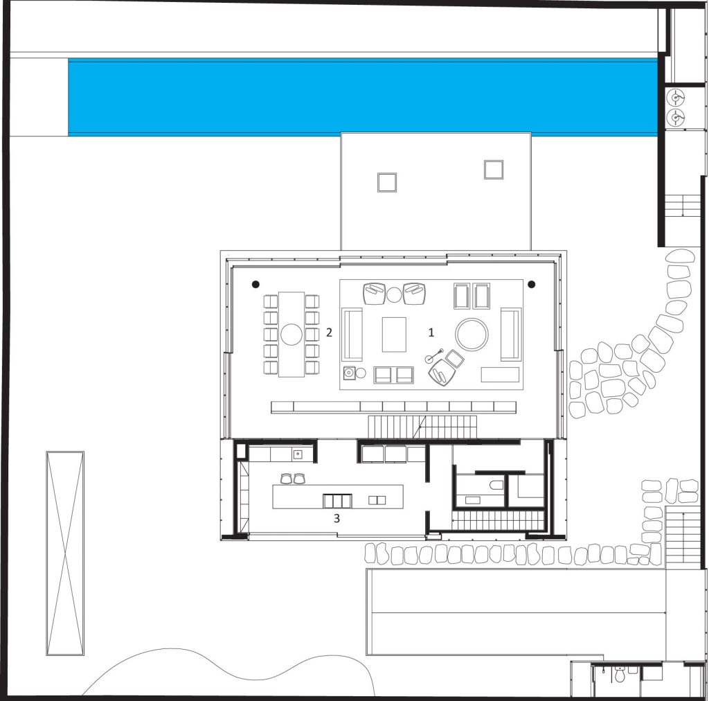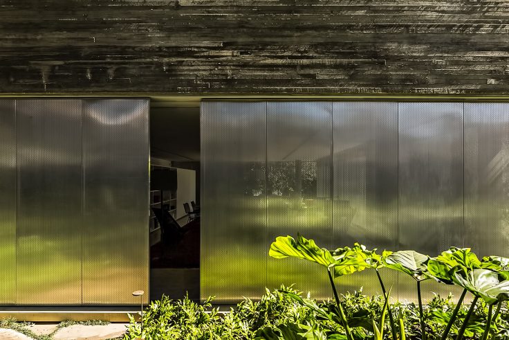 The large minimalistic structure separates the ground-level interior spaces of the home with multiple recessed sliding glass doors that characterize the living experience of subtracting volume from the cube.