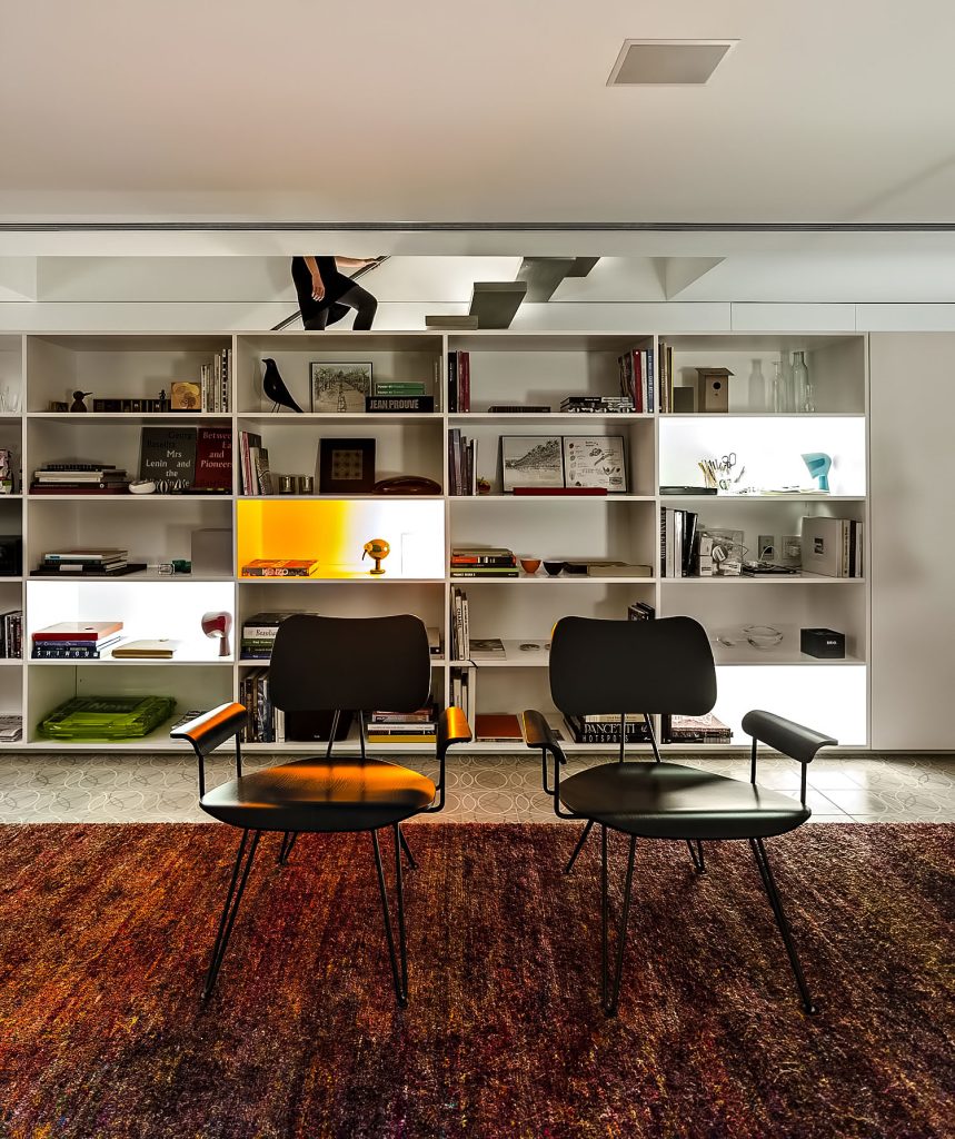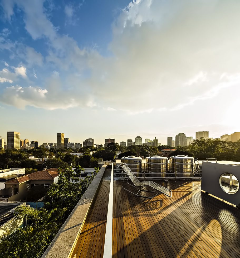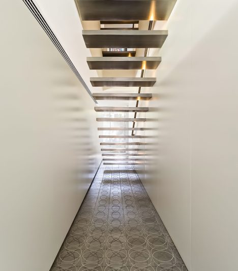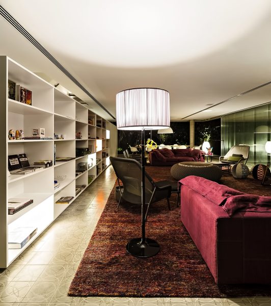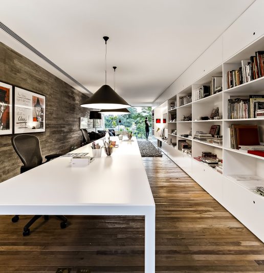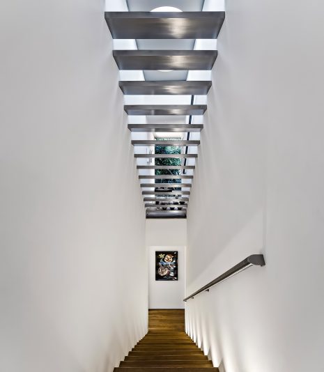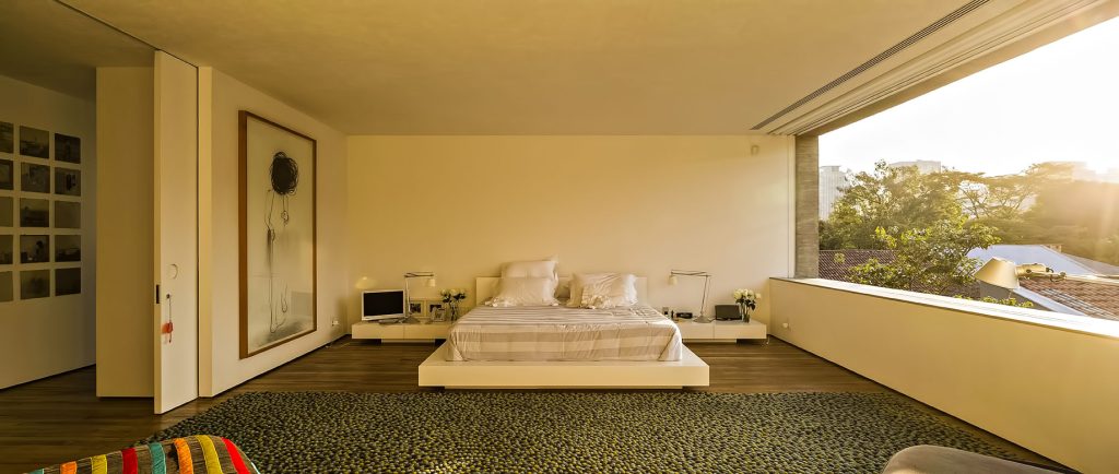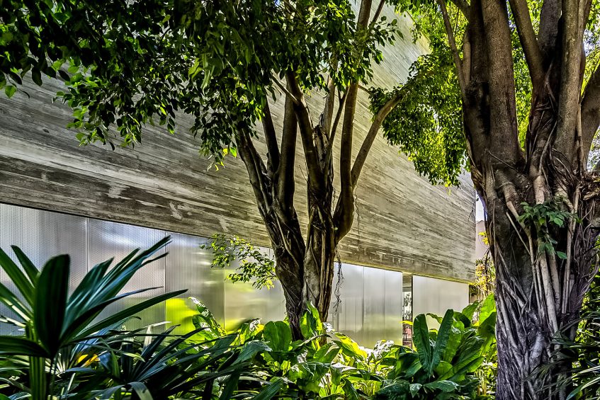 The modern architectural structure uses negative space and volume to create openness wherever necessary. The magnitude of the concrete structure is deliberately balanced with materials and colors that blend into the surroundings creating an atmosphere of harmony with nature.