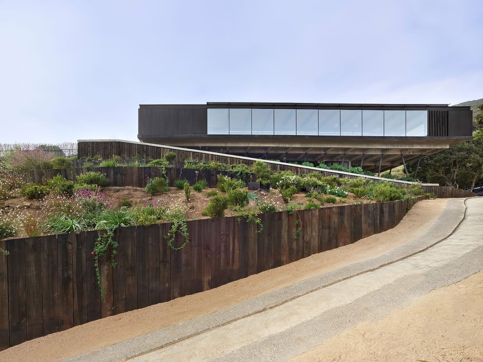 Casa Manns is a luxury residence architected as a rectangular pavilion cantilevering over a slope, as if it were an apartment unit detached from a high building, slightly supported on the hill. The fifth façade is designed as a base platform of the house: a ribbed, reinforced concrete slab that emerges from a base that contains part of the program.