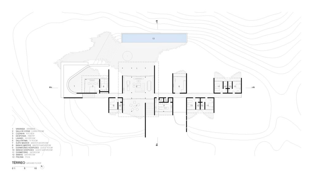Casa Terra comes from the intercalation of parallel walls made of pigmented concrete perpendicular to the central circulation gallery. The articulation between these components generates spaces that sometimes delimit residential functions or create patios that open to the main garden.