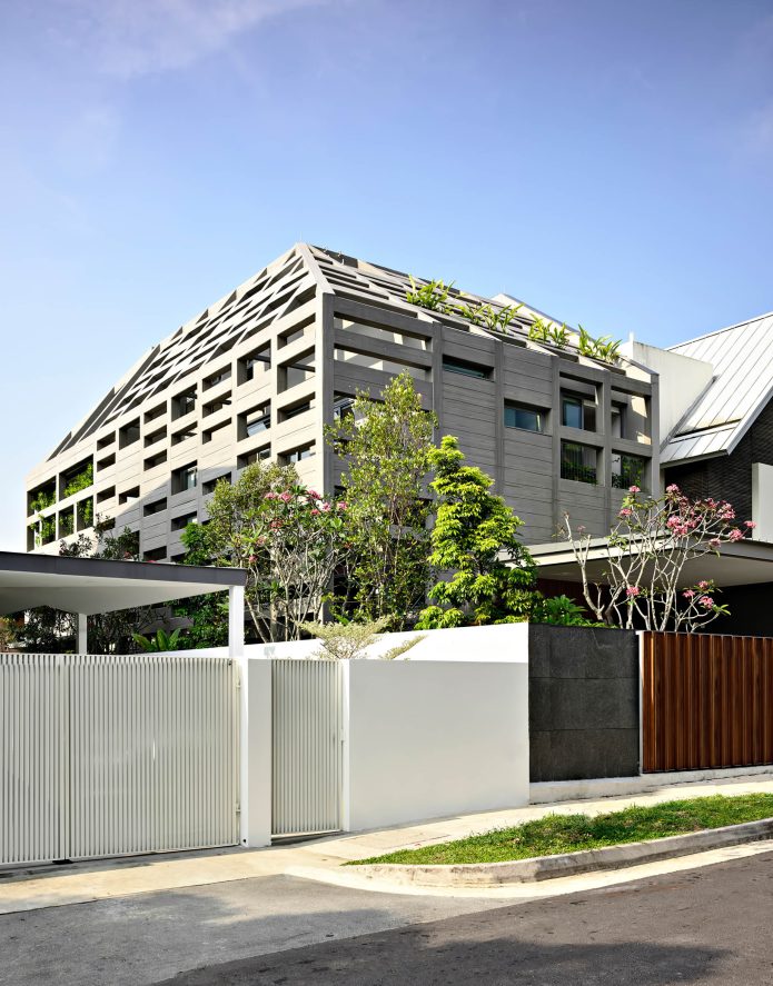 The plasticity and structural capability of concrete presents a myriad of construction details deserving of one’s attention and showcase as done so in this structurally unique luxury property designed by HYLA Architects. At the very early stage of the design process, model making is a powerful tool to study the geometry of form and structural function, the modularity and the porosity. Realized with a clarity of structure in mind, the models shell was crafted in vertical and horizontal balsa wood strips, representing the concrete columns and beams / louvers in a modular size.