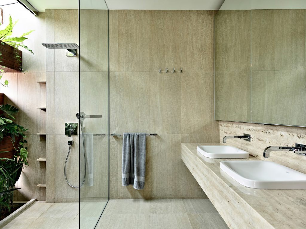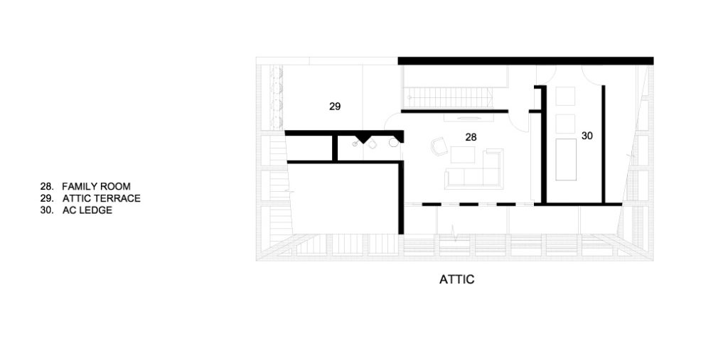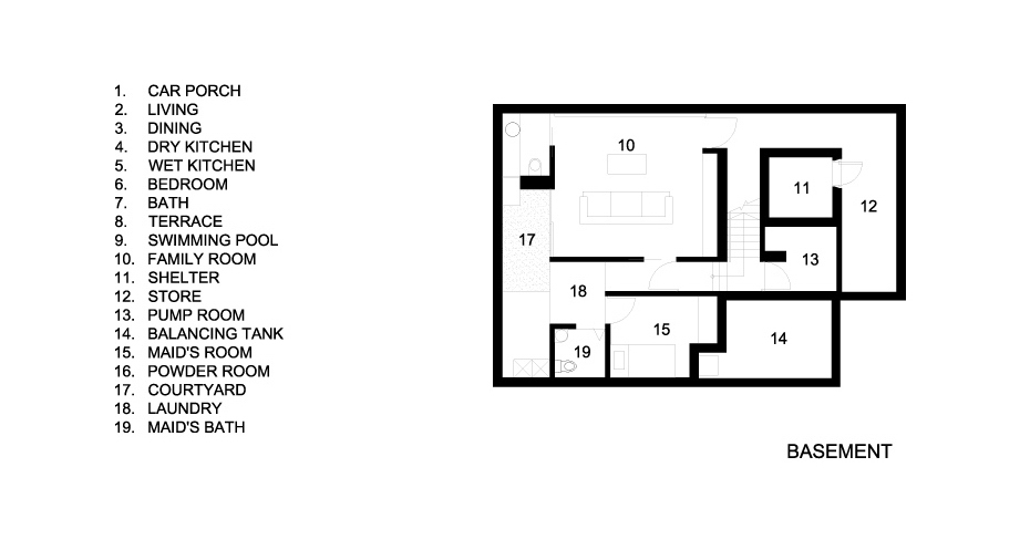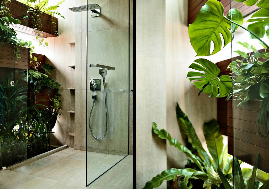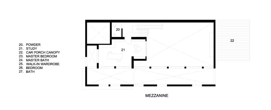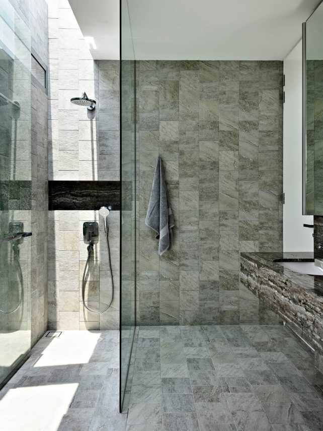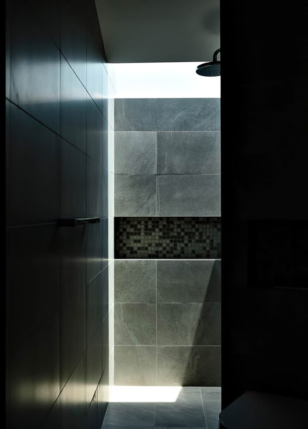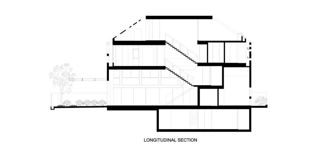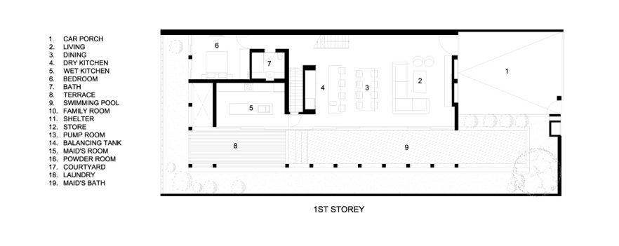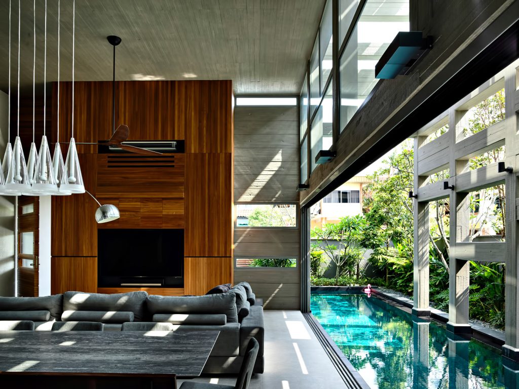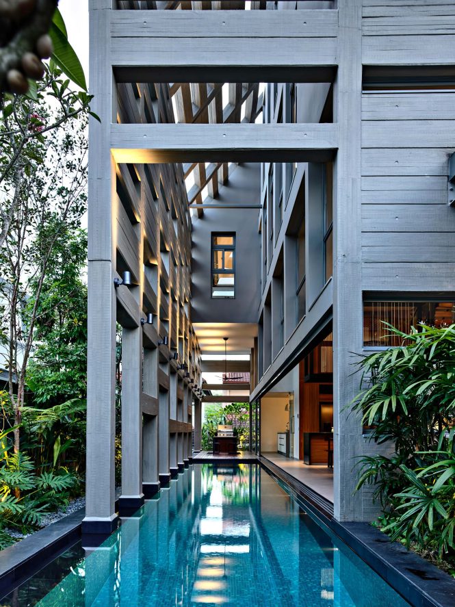 The swimming pool unassumingly extends deep into the house to become the key focus in the planning of spaces around this triple volume “courtyard”. From the inside, the spatial experience is animated by the array of framed apertures to the exterior green that extends to become part of the landscape of the interior.