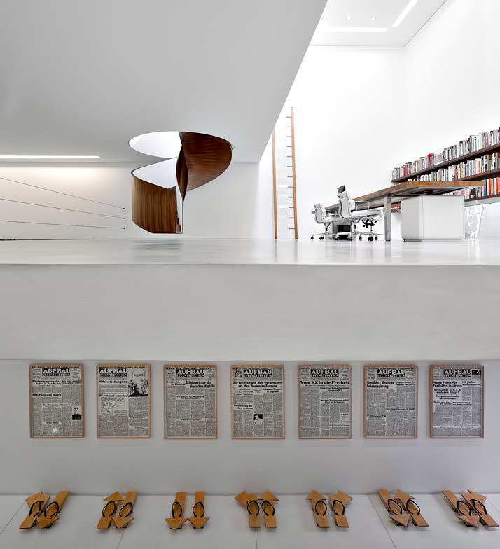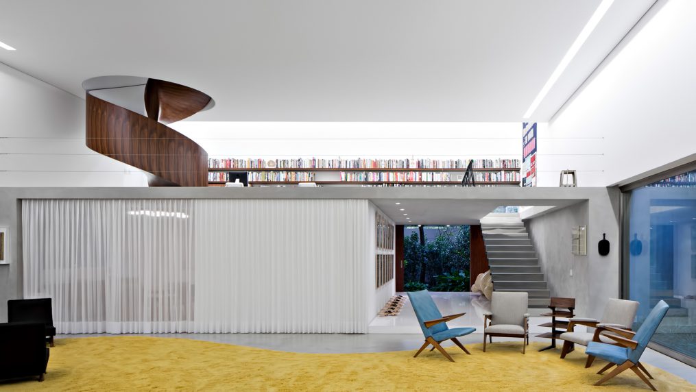 The mezzanine of the lounge, standing on the slab topping the service nucleus on the ground floor, houses the library, which is marked by three strong elements: a shelving unit extending the whole back wall, a strip of fixed glass next to the floor and a spiral staircase covered in wood that leads to the private quarters upstairs.