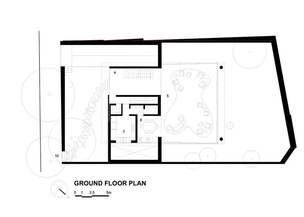 Private quarters consist of bedrooms and a living room thoroughly lit through a floor-to-ceiling opening. This is a place not only to live, but also a place to receive people in style.