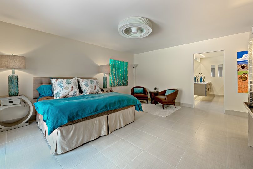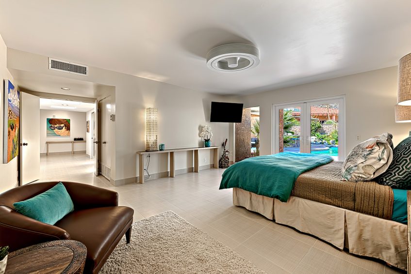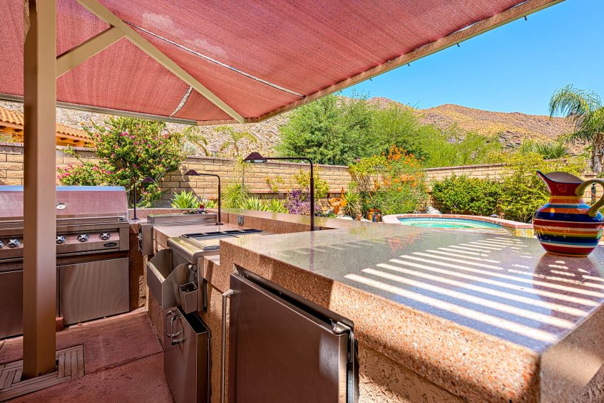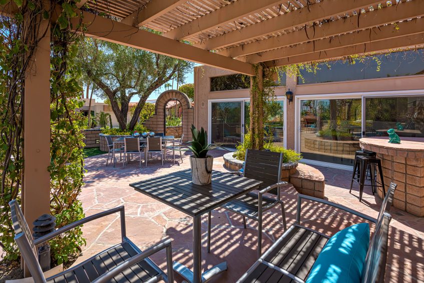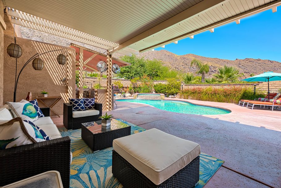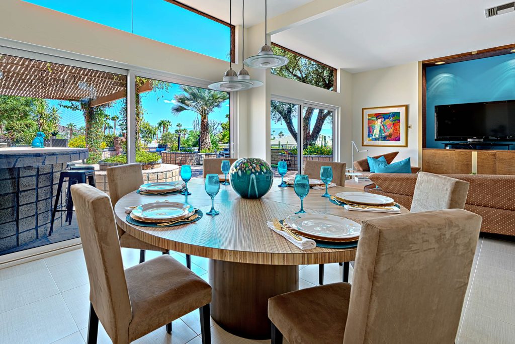 The living and dining rooms flow seamlessly to the kitchen and family room with wet-bar and fireplace. The spacious master bedroom suite has French doors opening out to the pool and huge views of the San Jacinto Mountains. Three additional bedrooms provide plenty of room for family and guests to spread out and relax.