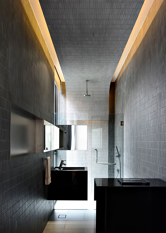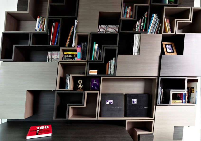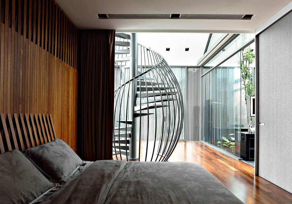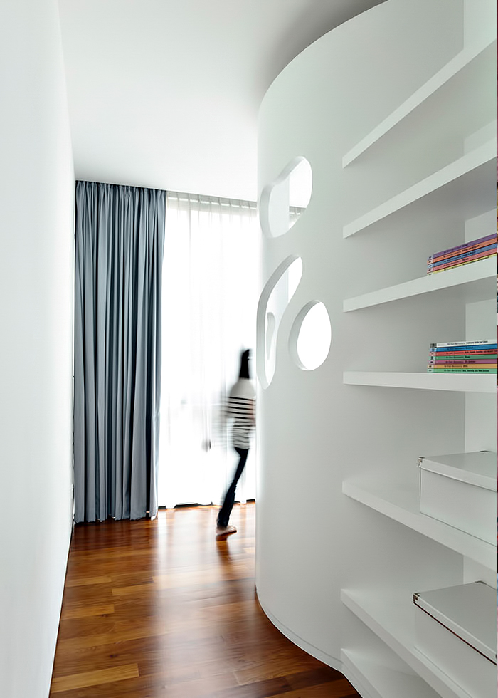 Upstairs, the master bedroom features a rainforest tree in the middle. A unique spiral staircase connects the master bedroom to the study above. Here, the shelves are inspired by the shape of the Ligne Roset sofas. Finally, the remaining bedrooms and bathrooms are custom designed personalized accordingly for children.