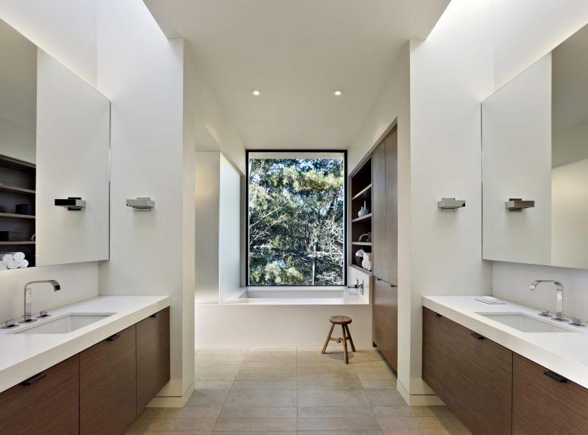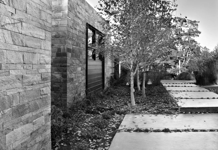 Choosing a neutral antiesthetic tone, the exterior accentuated with Vermont stone is complimented by an interior with neutral hues and a structure surrounded by natural elements with a wide-open airy feeling that is transposed throughout the dwelling.