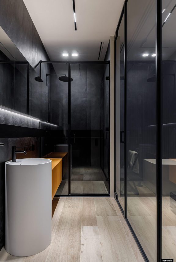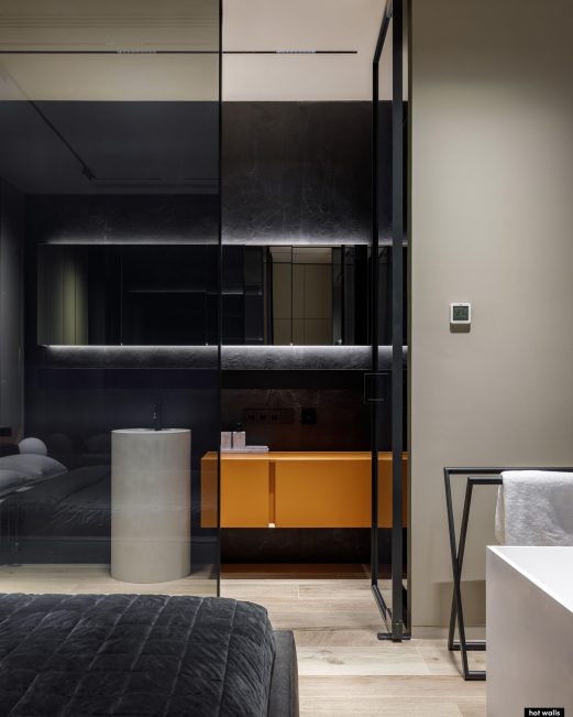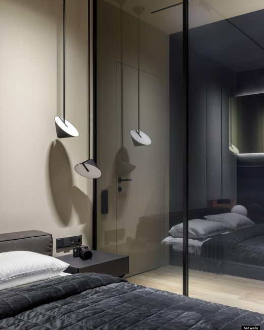 Sleek futuristic features include a bathtub by the bed in the bedroom with walls made of smart glass with two modes (frosted / transparent) of dimming for a spectacular wow effect. A second bed is hidden in the niche of the wardrobe for travelers with children or guests.