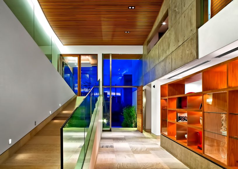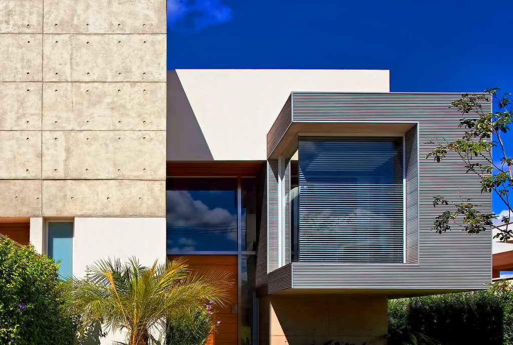 The substantial concrete and metal-clad structure envelopes the large geometric volume of the residence, devised with an attractive composition of form and functionality that permits easy flow between the inner and outer spaces of the property.