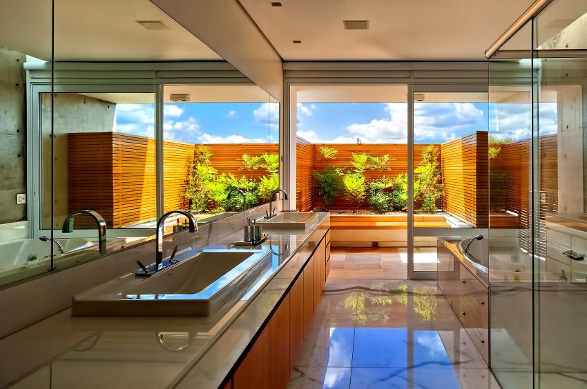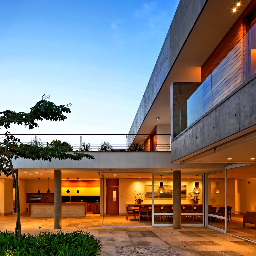 Designed as if it were a vacation villa within the city of Araraquara in Brazil, this L-shaped home offers abundant living space with a robust resort-style environment that features an open courtyard with a large garden area and swimming pool.