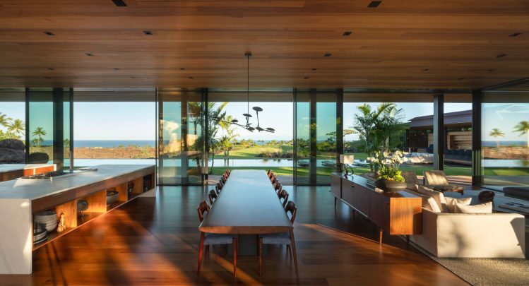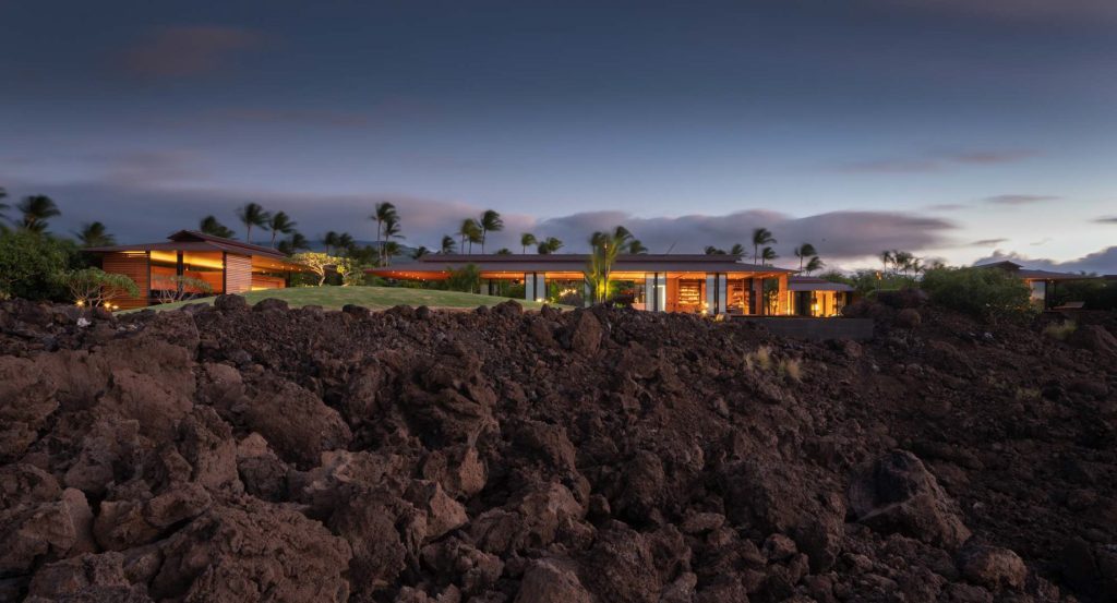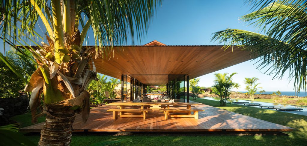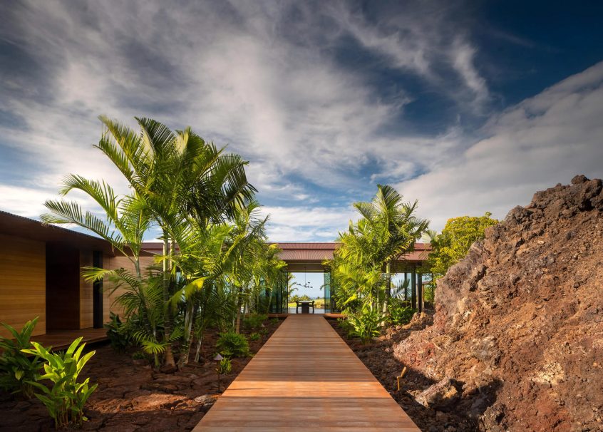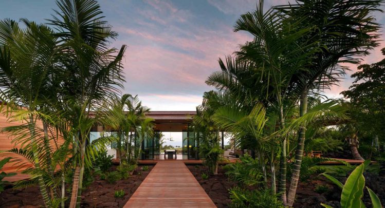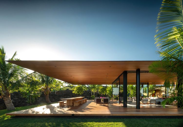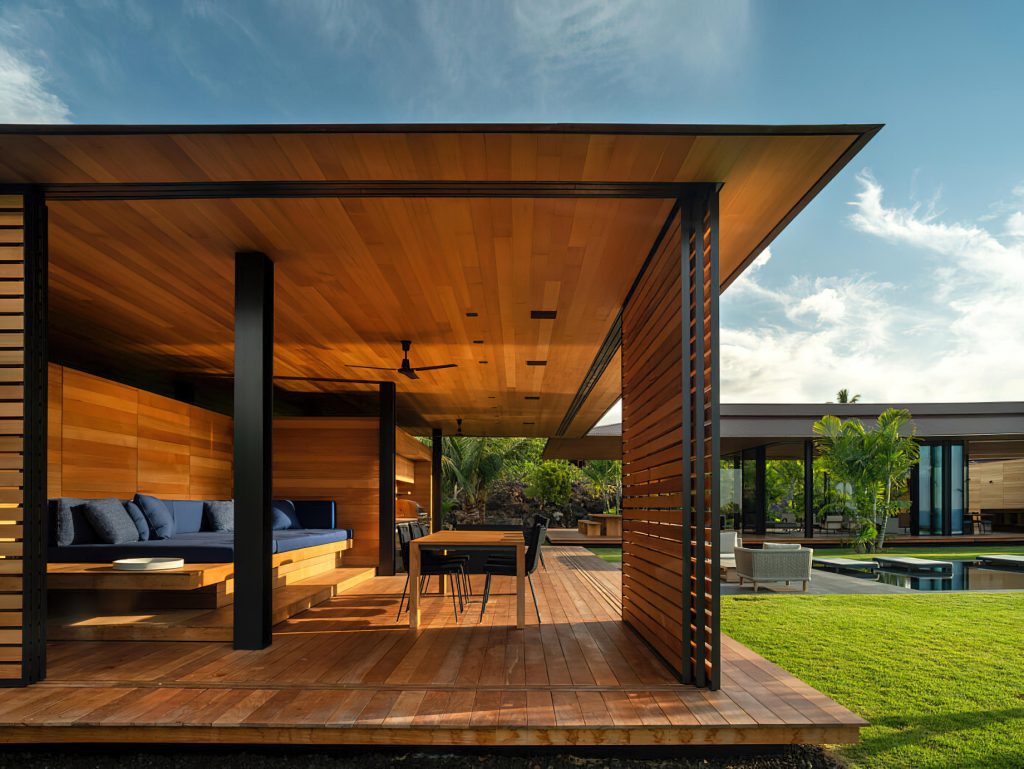 Hale Lana is an exquisite family retreat nestled on Hawaii’s Big Island, featuring a captivating design composed of several canopy-like pavilions scattered across the landscape. These pavilions are interconnected by elevated wooden lanais and a series of beautifully crafted gardens. Positioned at the ecotone line, where the meticulously landscaped area meets the breathtaking ocean views stretching towards the majestic Haleakalā volcano on Maui, this home truly embodies its name, which translates to “floating home.” Its key design objective was to achieve a seamless integration of the indoor and outdoor spaces, fostering a high degree of transparency.