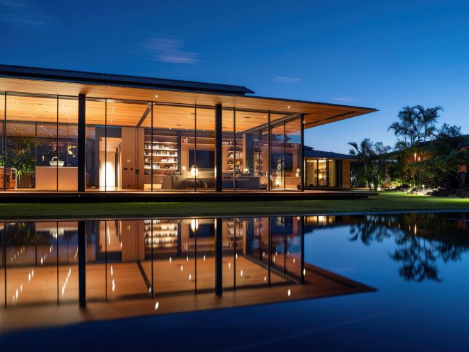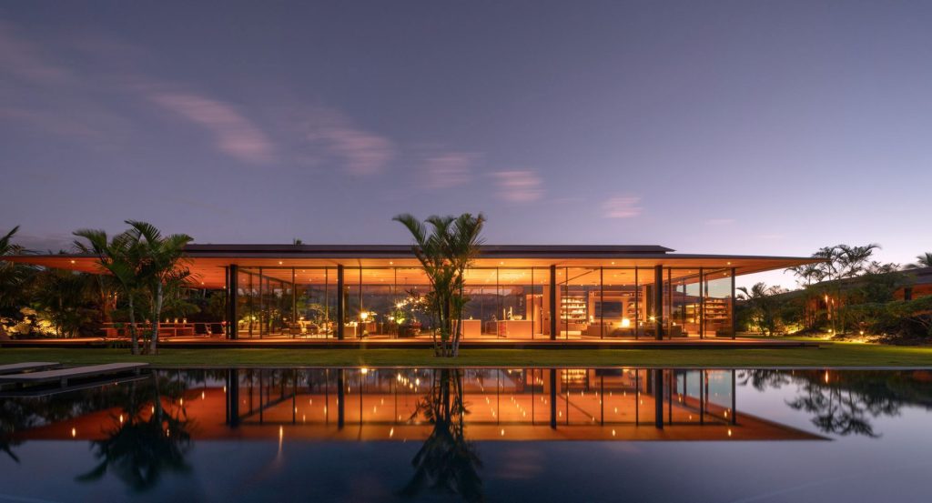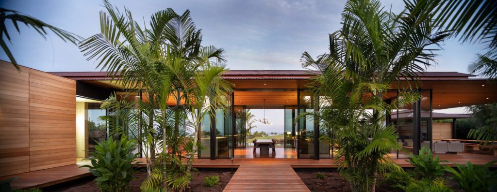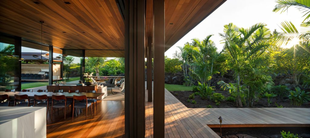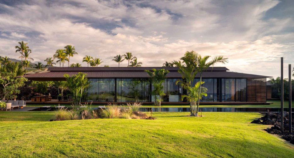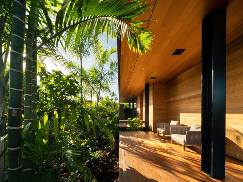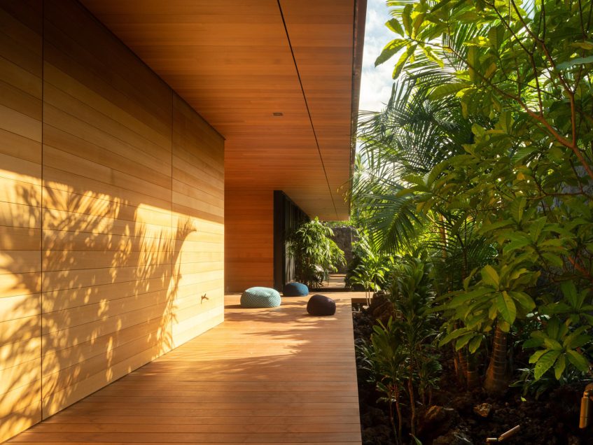 Hale Lana is an exquisite family retreat nestled on Hawaii’s Big Island, featuring a captivating design composed of several canopy-like pavilions scattered across the landscape. These pavilions are interconnected by elevated wooden lanais and a series of beautifully crafted gardens. Positioned at the ecotone line, where the meticulously landscaped area meets the breathtaking ocean views stretching towards the majestic Haleakalā volcano on Maui, this home truly embodies its name, which translates to “floating home.” Its key design objective was to achieve a seamless integration of the indoor and outdoor spaces, fostering a high degree of transparency.