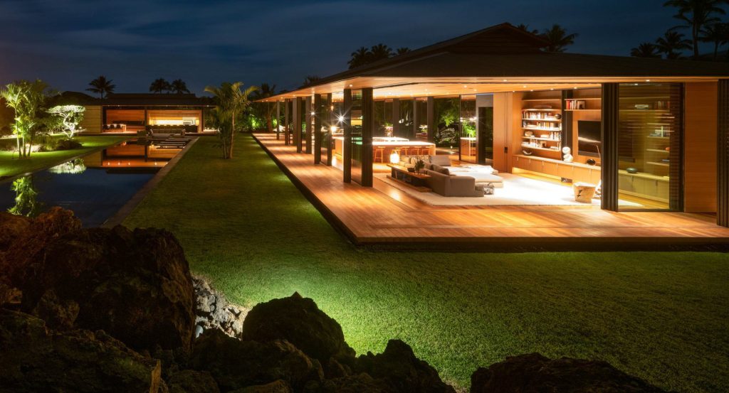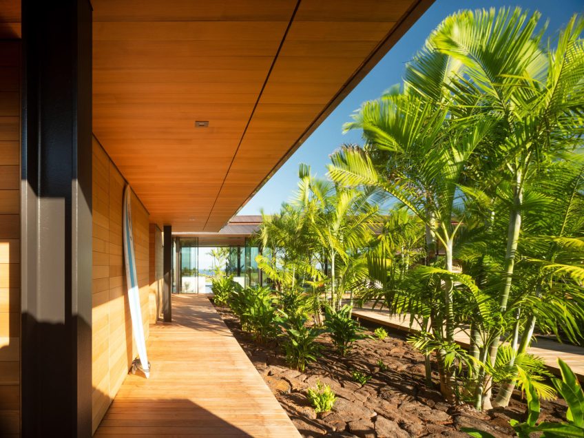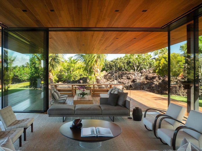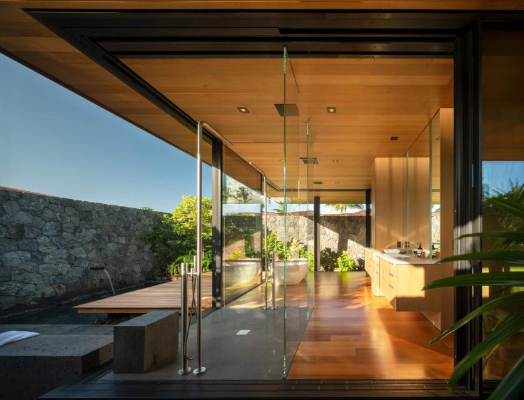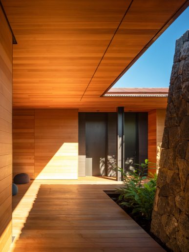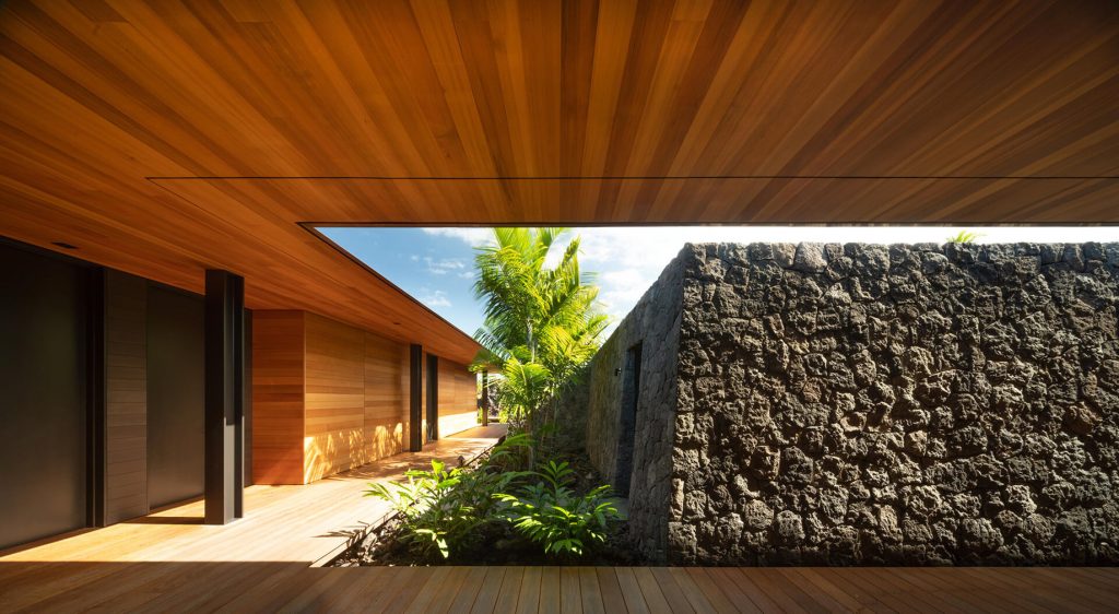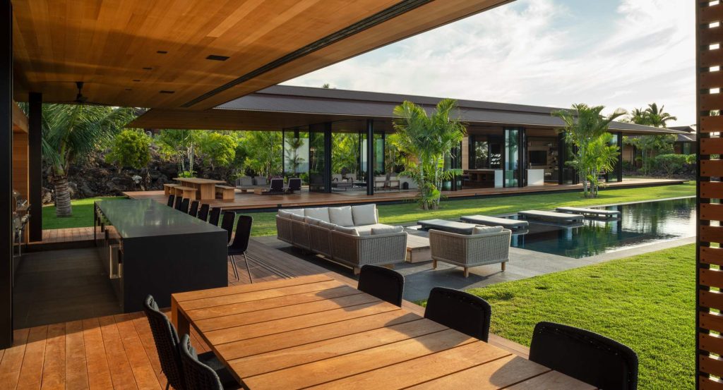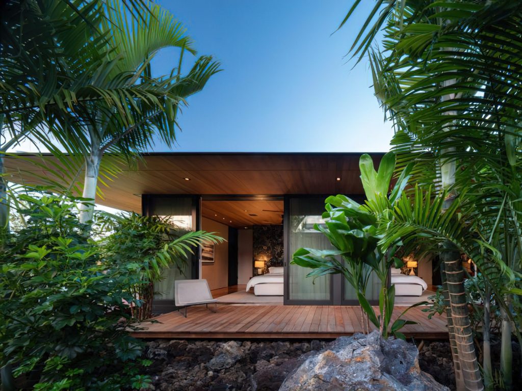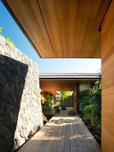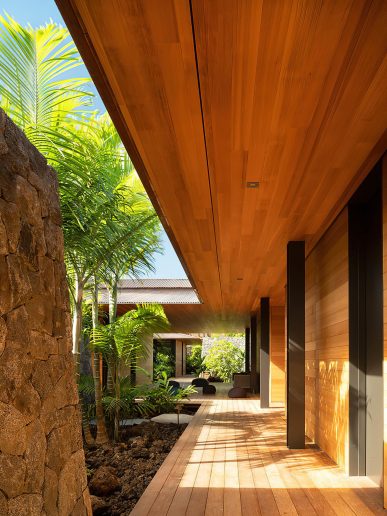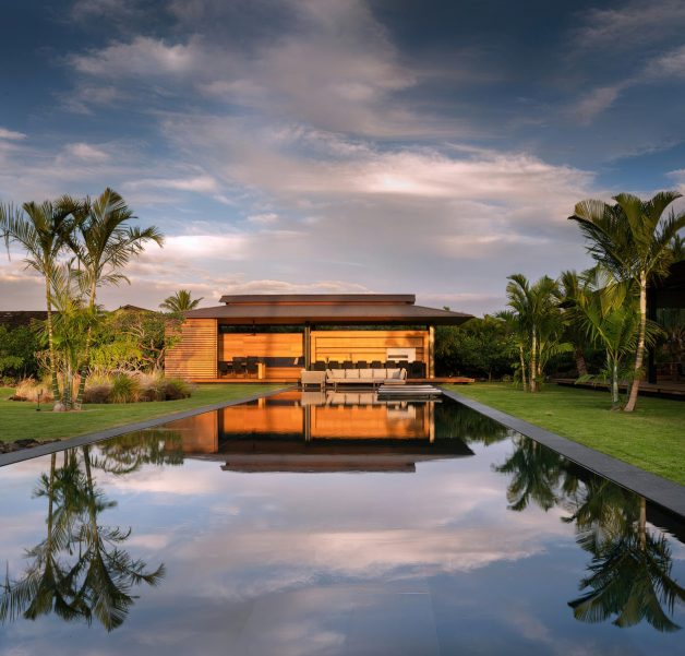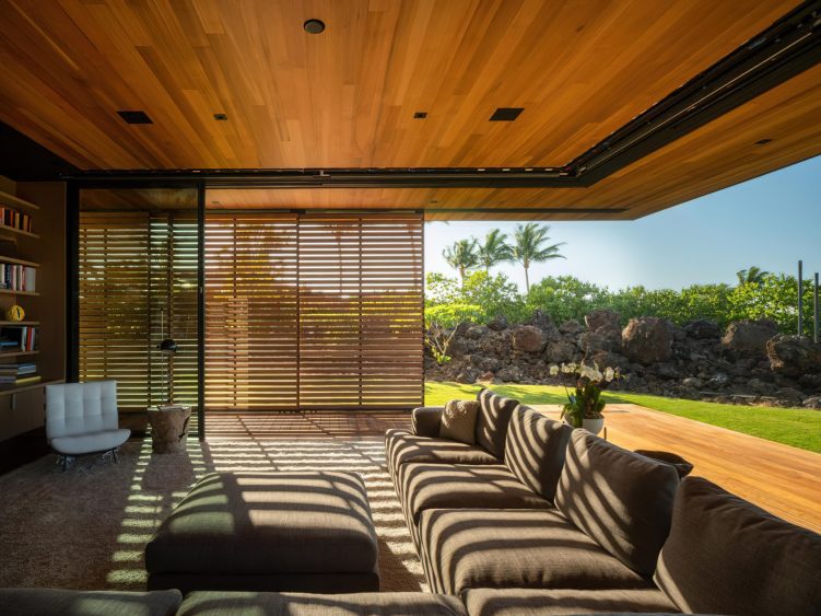 The iconic cantilevered double-pitch roofs, synonymous with the Big Island style, form deep canopies that gracefully encircle the pavilions and their lanais. These canopies enable the pavilions to open up entirely to the invigorating ocean breezes while providing protection against the sun’s rays. The addition of operable shutter screens empowers the family to adapt each building to the ever-changing environmental conditions, allowing them to fine-tune the desired degree of sunlight, airflow, and privacy. The integration of rock walls in several pavilions further extends the connection between the home and the captivating Kona landscape. Every aspect of Hale Lana, from its custom-designed furniture to its meticulously curated interior elements, serves as a subtle homage to the enchanting Hawaiian culture and complements the architectural design flawlessly.