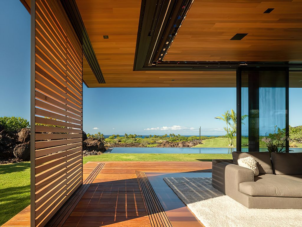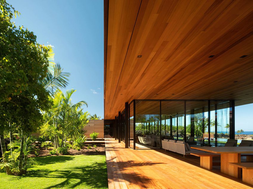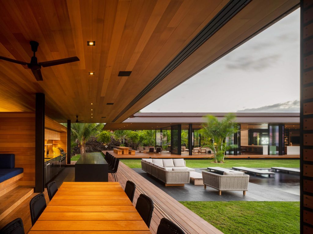 The architectural marvel of Hale Lana showcases cantilevered double-pitch roofs, a characteristic feature of the Big Island style. These roofs gracefully form deep canopies enveloping the buildings and lanais, allowing for uninterrupted ocean breezes to flow through while shielding the interiors from excessive solar heat. With extensive glazing throughout, the architecture seemingly hovers above the landscape, creating an ethereal experience. The implementation of operable shutter screens empowers the family to adapt each building to changing environmental conditions, enabling them to regulate sunlight, airflow, and privacy. By blurring the boundary between the interior and exterior, Hale Lana establishes an inseparable connection between the residents and the enchanting Hawaiian climate and landscape.