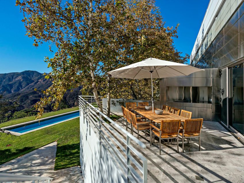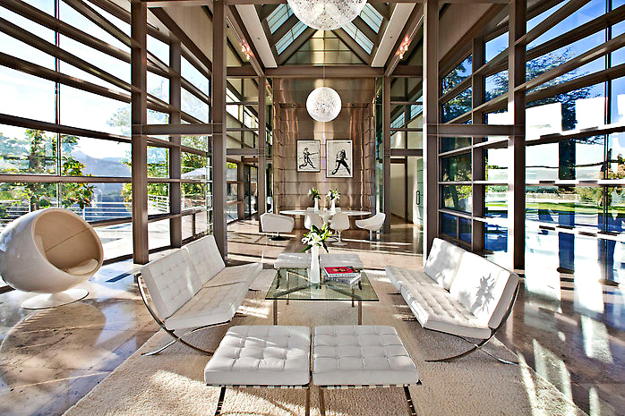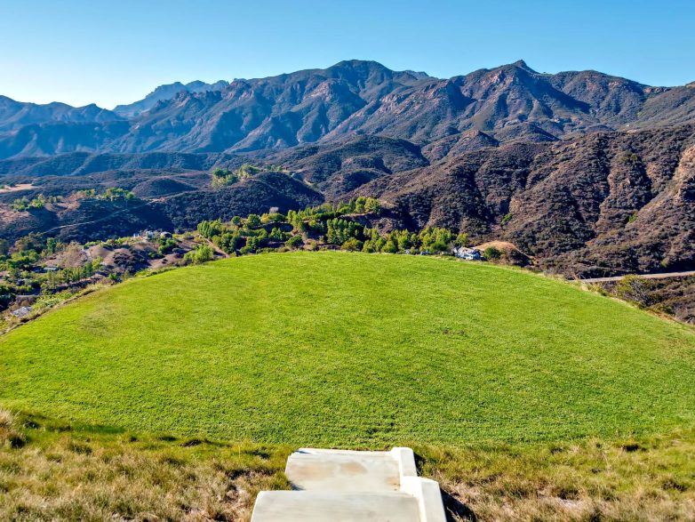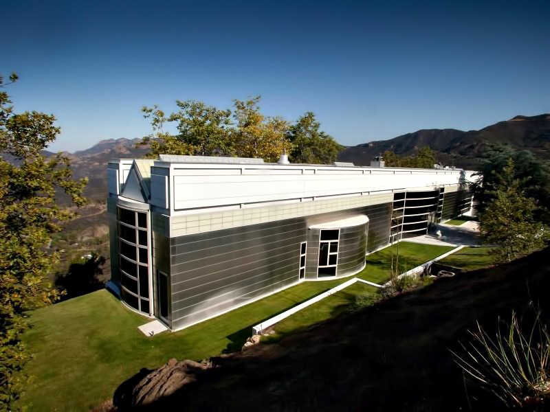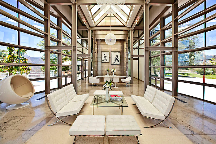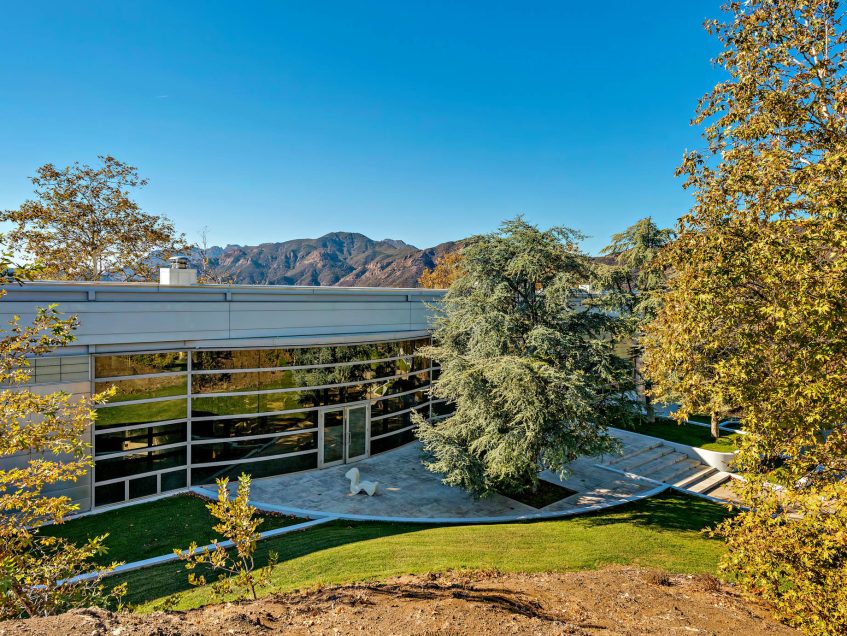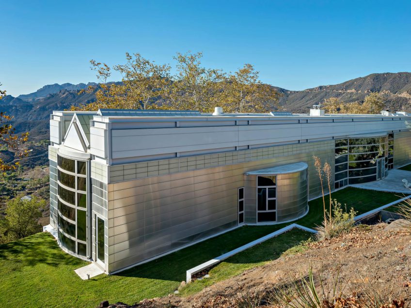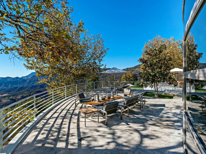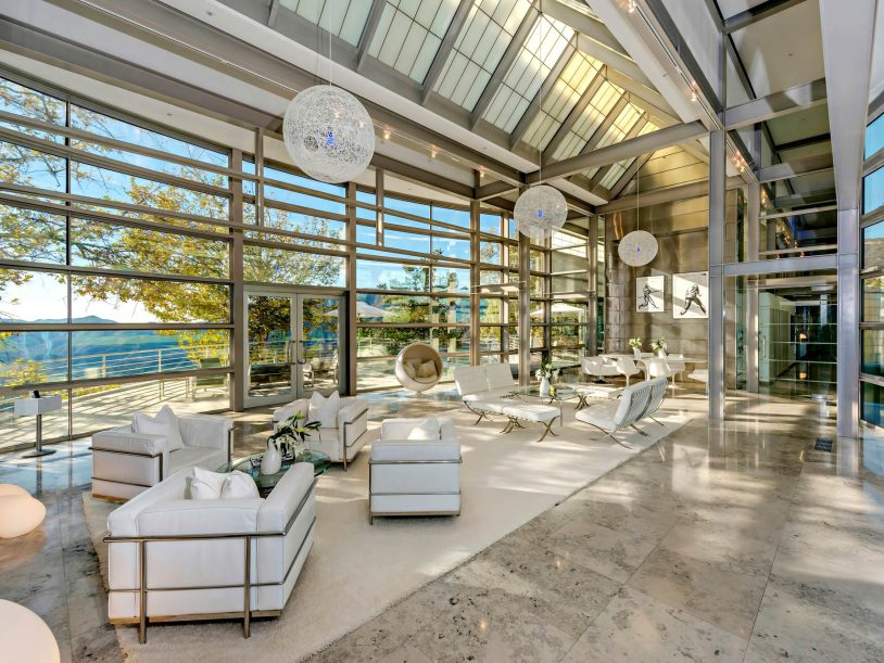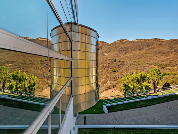 This distinctive glass and steel luxury estate is a work of art that you can live in. Set atop a large promontory overlooking the Malibu canyons below, the dramatically architected residence sits on over fifteen acres of green lawns with unobstructed mountaintop white-water views out to the blue Pacific Ocean and across the Santa Monica mountains.
