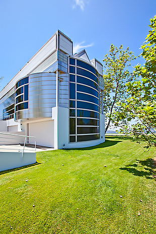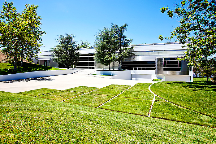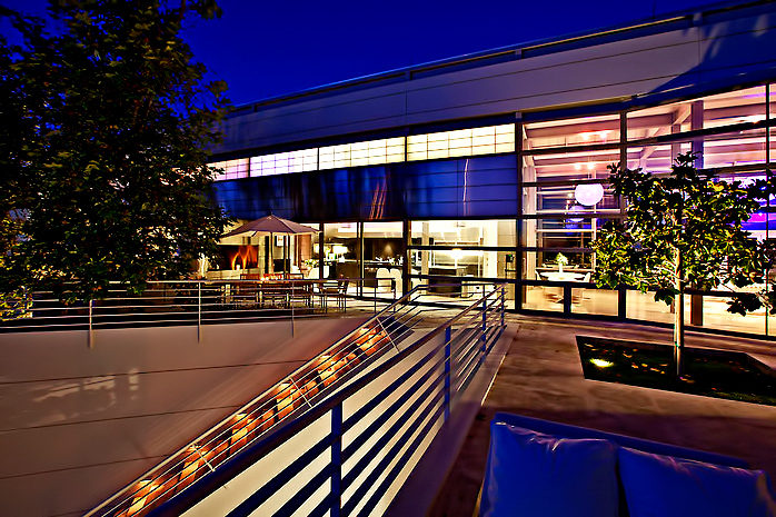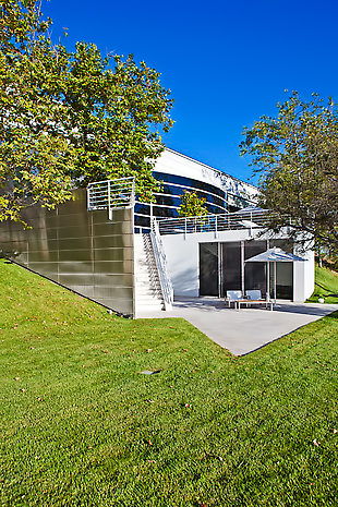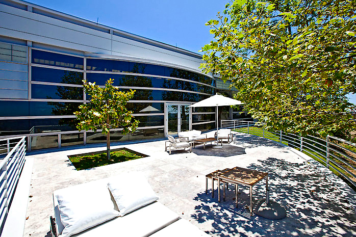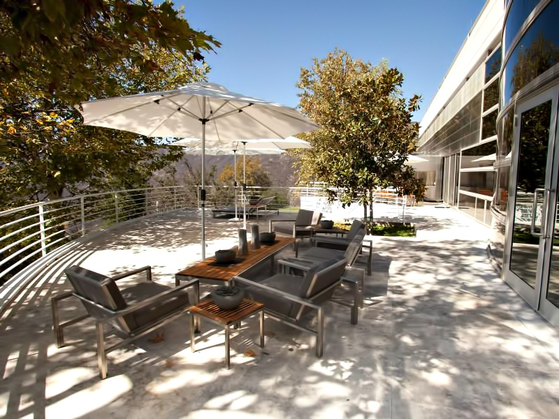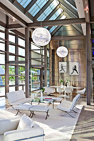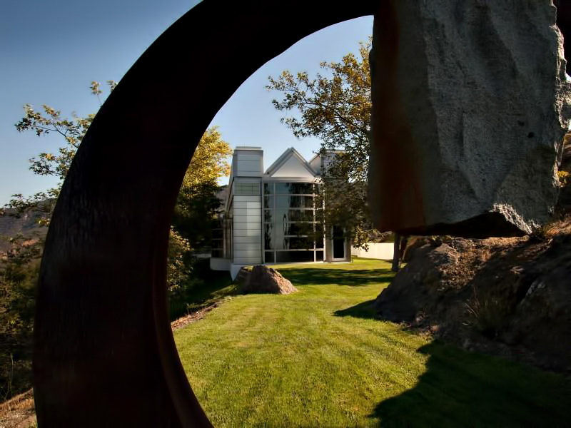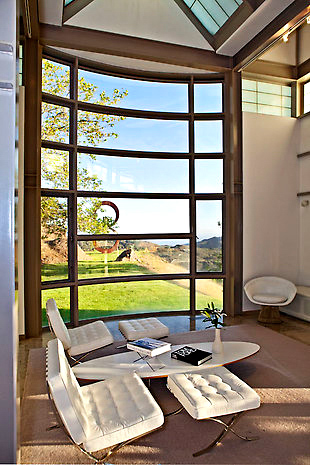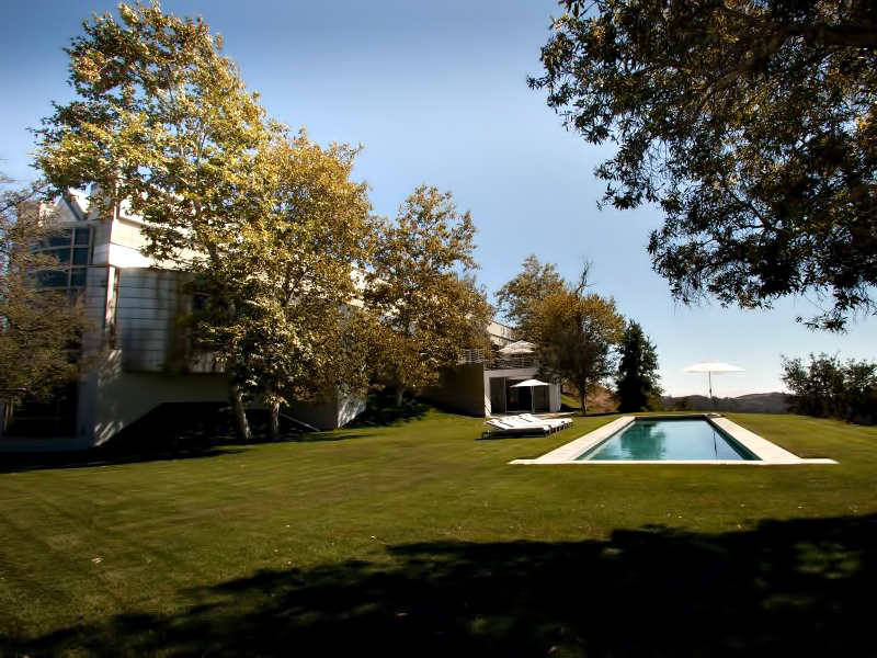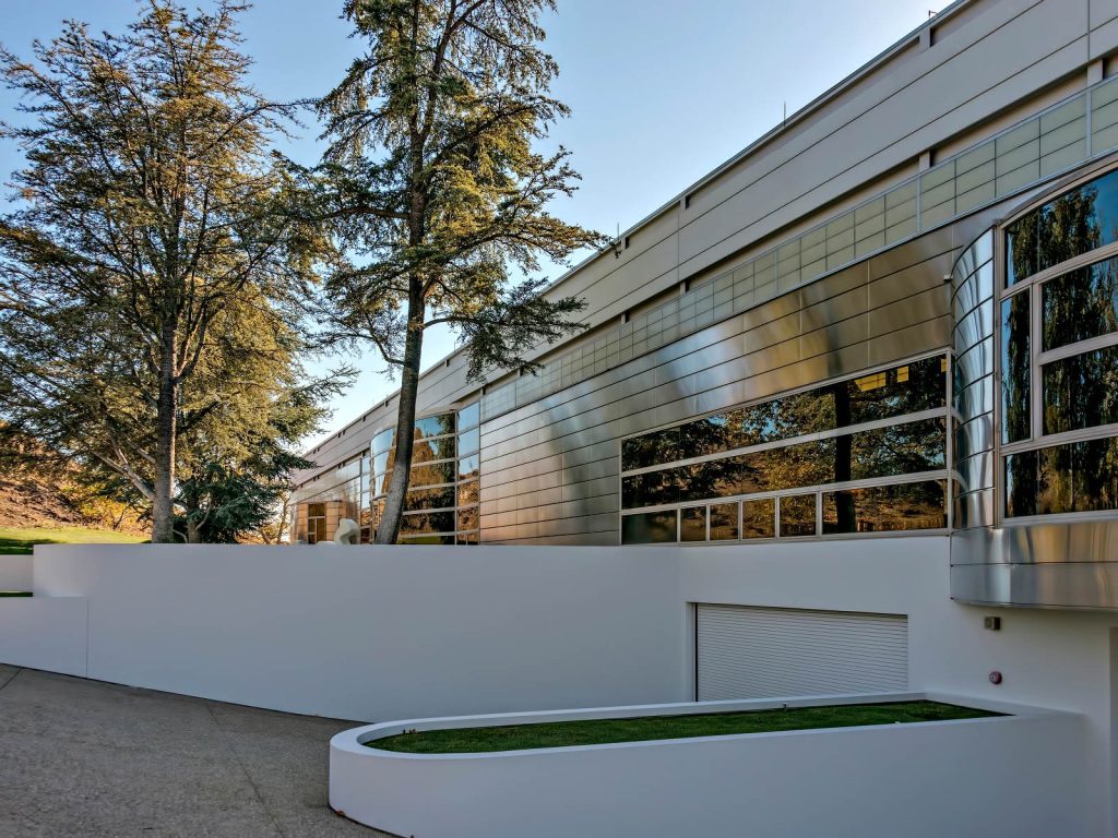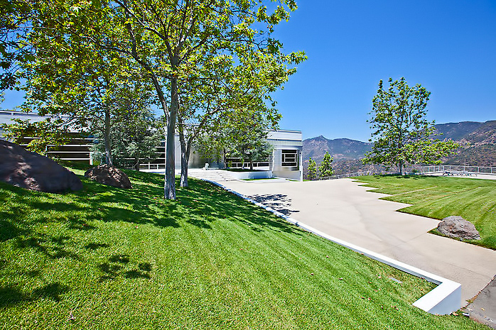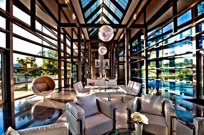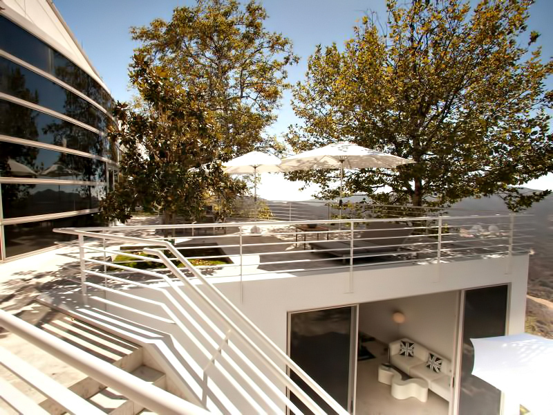 This distinctive glass and steel luxury estate is a work of art that you can live in. Set atop a large promontory overlooking the Malibu canyons below, the dramatically architected residence sits on over fifteen acres of green lawns with unobstructed mountaintop white-water views out to the blue Pacific Ocean and across the Santa Monica mountains.