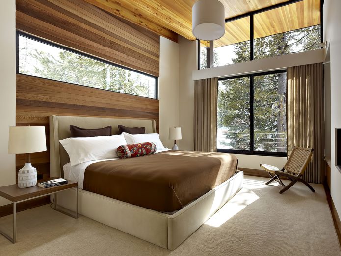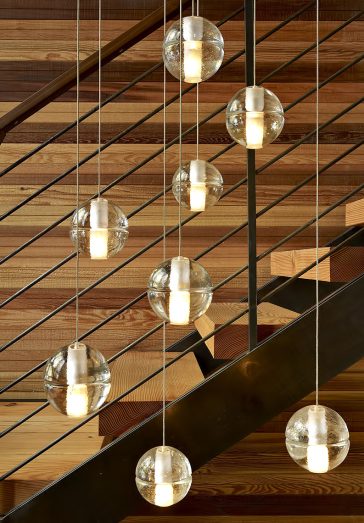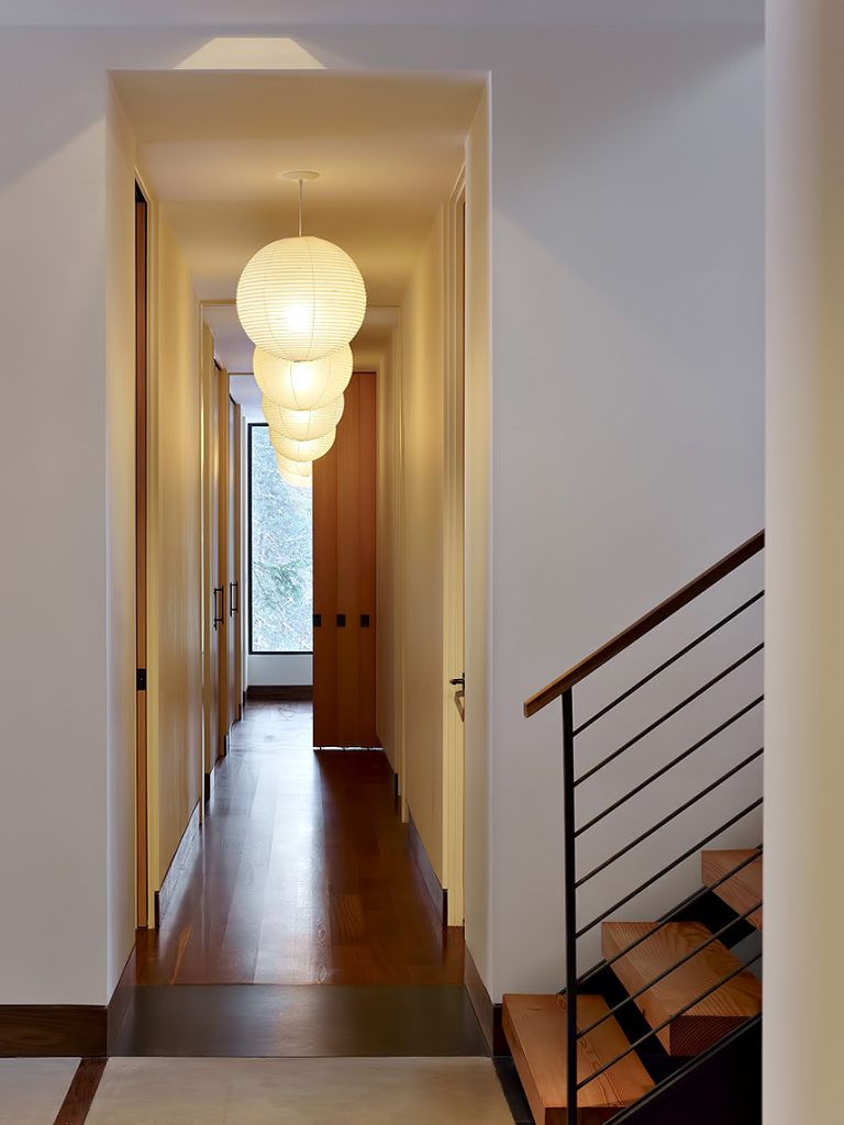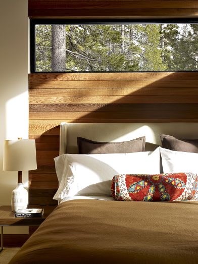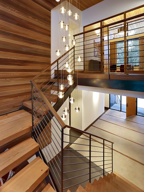In an otherwise horizontally oriented house, a two-story glazed wall at the main stair provides a singular vertical perspective on the stands of surrounding pines and provides a moment of transition from the heavier base element to the light-filled airy spaces above. On the upper level, a variety of living spaces and the master bedroom suite, each enjoying mountain views, are gathered between the linear roof form and the simple block below. The interior palette of walnut, fir, concrete, and steel strikes a balance between clean, modern spatial expression with the warm, rustic feel of a mountain home.