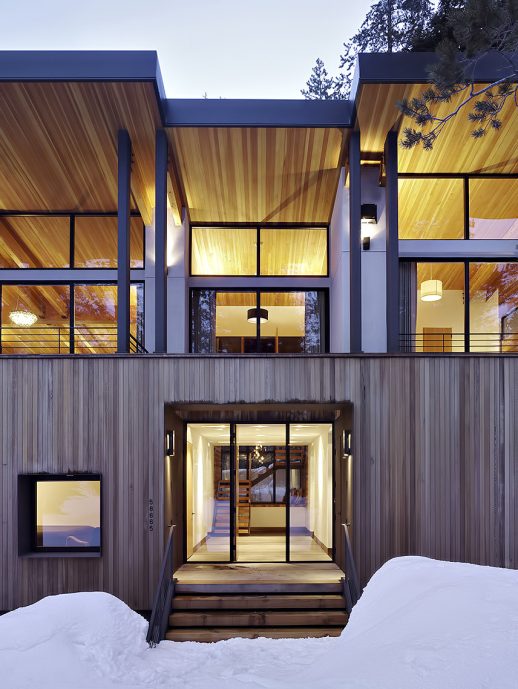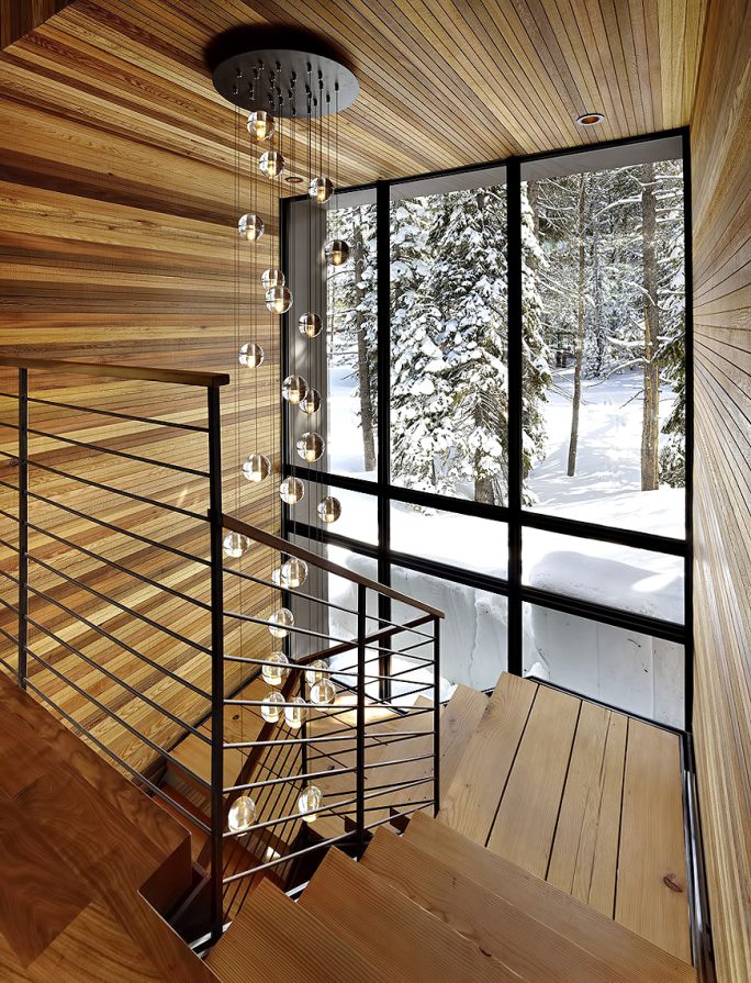 Perched on a concrete plinth that lifts it above the tall winter snowpack, the house allows snow to rise around it and meet the entry level. At the first floor, a solid, cedar-clad volume houses entry, boot room, childrenโs and guest bedrooms, and service spaces. The exaggerated and abstract geometry of the fenestration at this level frames exaggerated views of horizontal snowdrifts and vertical stands of pine trees.