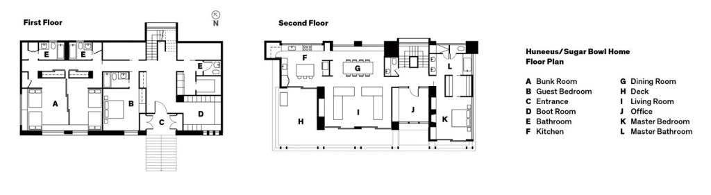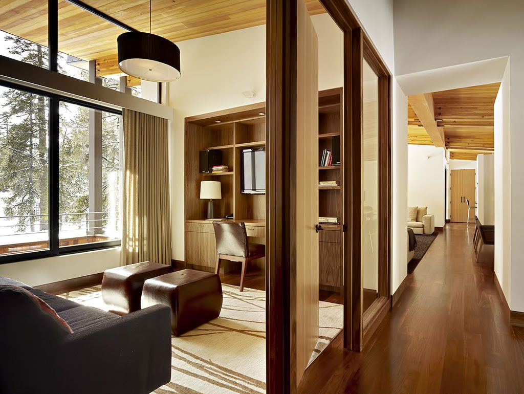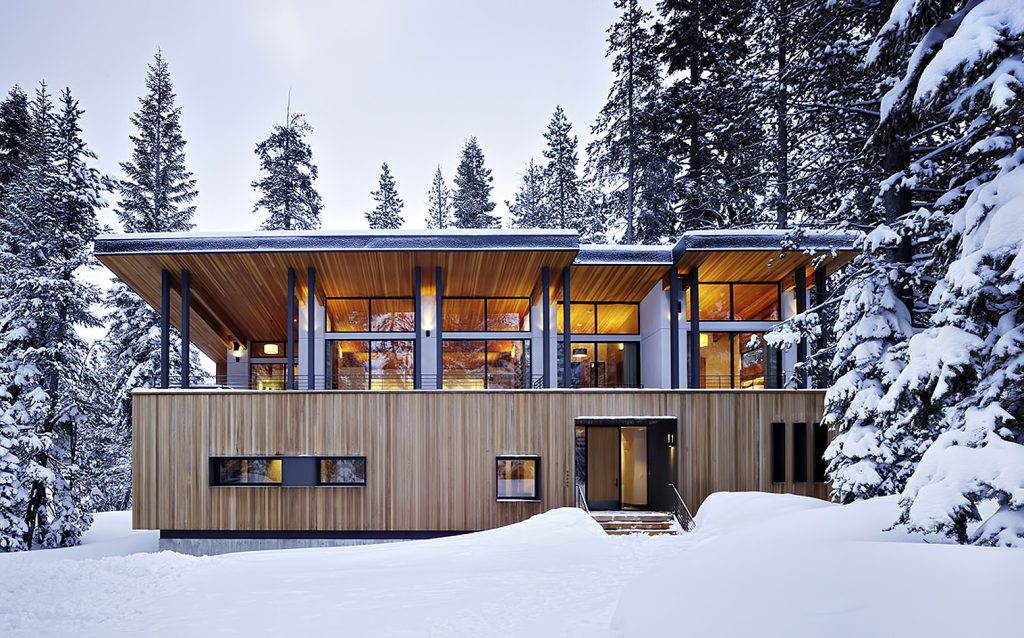 Blending seamlessly with its natural surroundings the design of this luxury residence vacation residence in the old village at Sugar Bowl is entirely a product of its dramatic environment. This house uses the constraints of its place to shape an elegant solution. Taking a historical railroad avalanche shed as a precedent, the house uses a simple, bent planar roof form to gather the rooftop snowpack and shed it to the rear of the structure, away from entry and pedestrian traffic.